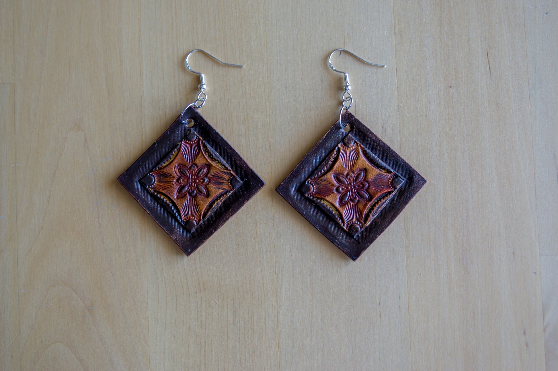 Brincos Artesanais de Couro em Losango – Design Floral em Tons Terra