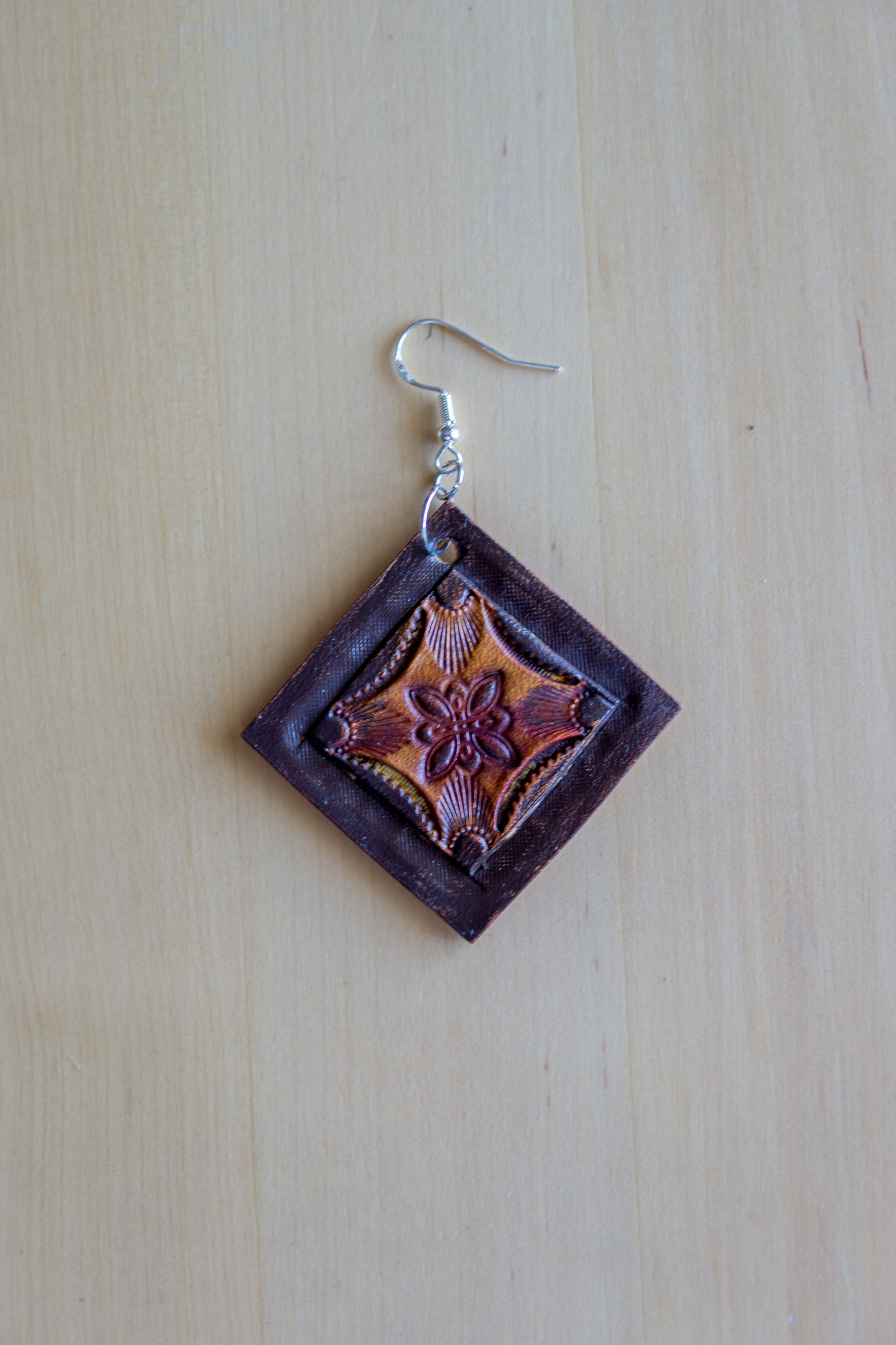 Estes brincos artesanais em forma de losango são o reflexo da beleza natural do couro trabalhado à mão.