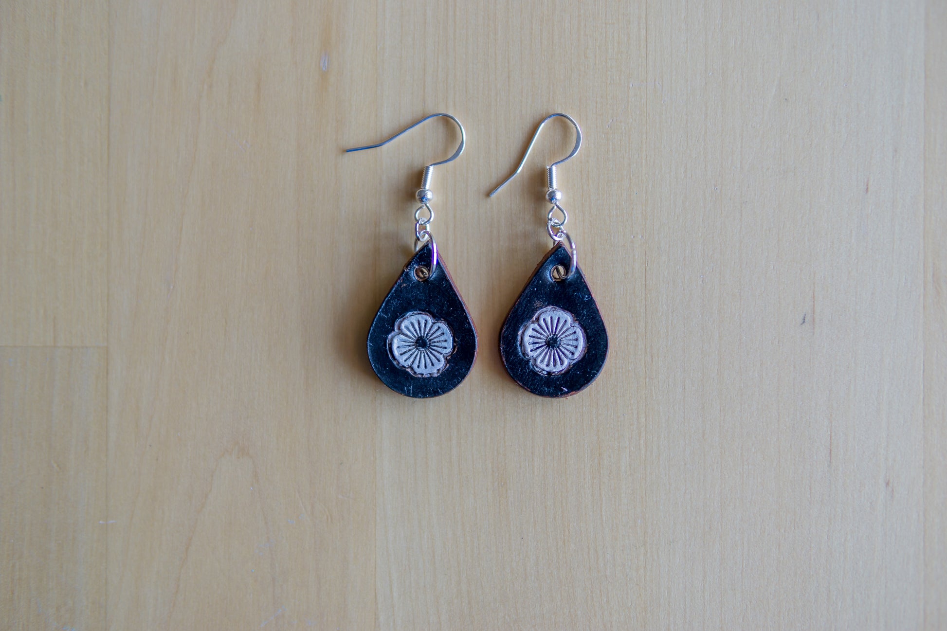 Brincos Artesanais em Couro - Gota Preta com Flor Branca