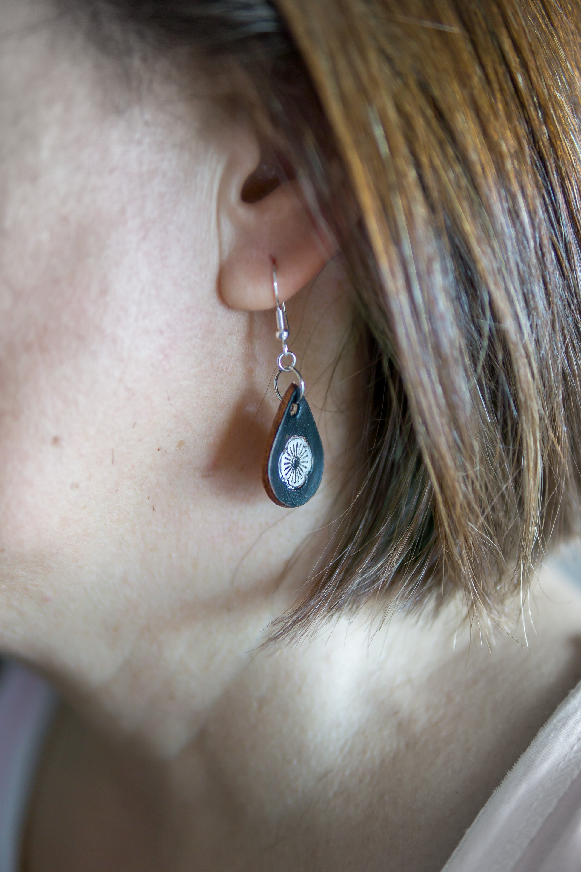 Elegância discreta com um toque artesanal — estes brincos em forma de gota são feitos à mão em couro legítimo e tingidos em tom preto profundo, com um delicado detalhe prateado em relevo ao centro, inspirado numa flor estilizada.