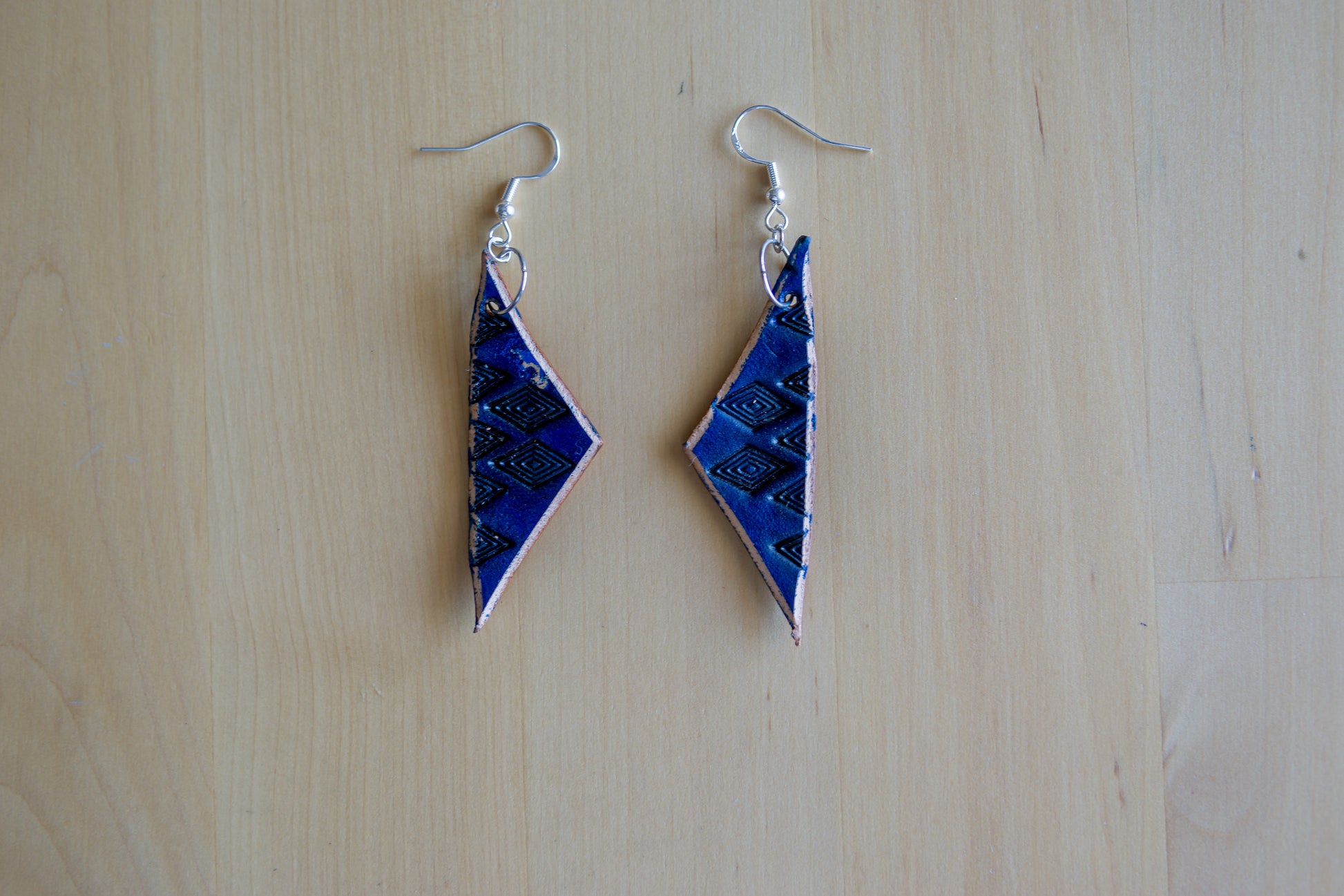 Brincos de Couro Artesanais Azul Indigo – Corte Assimétrico com Padrão Geométrico