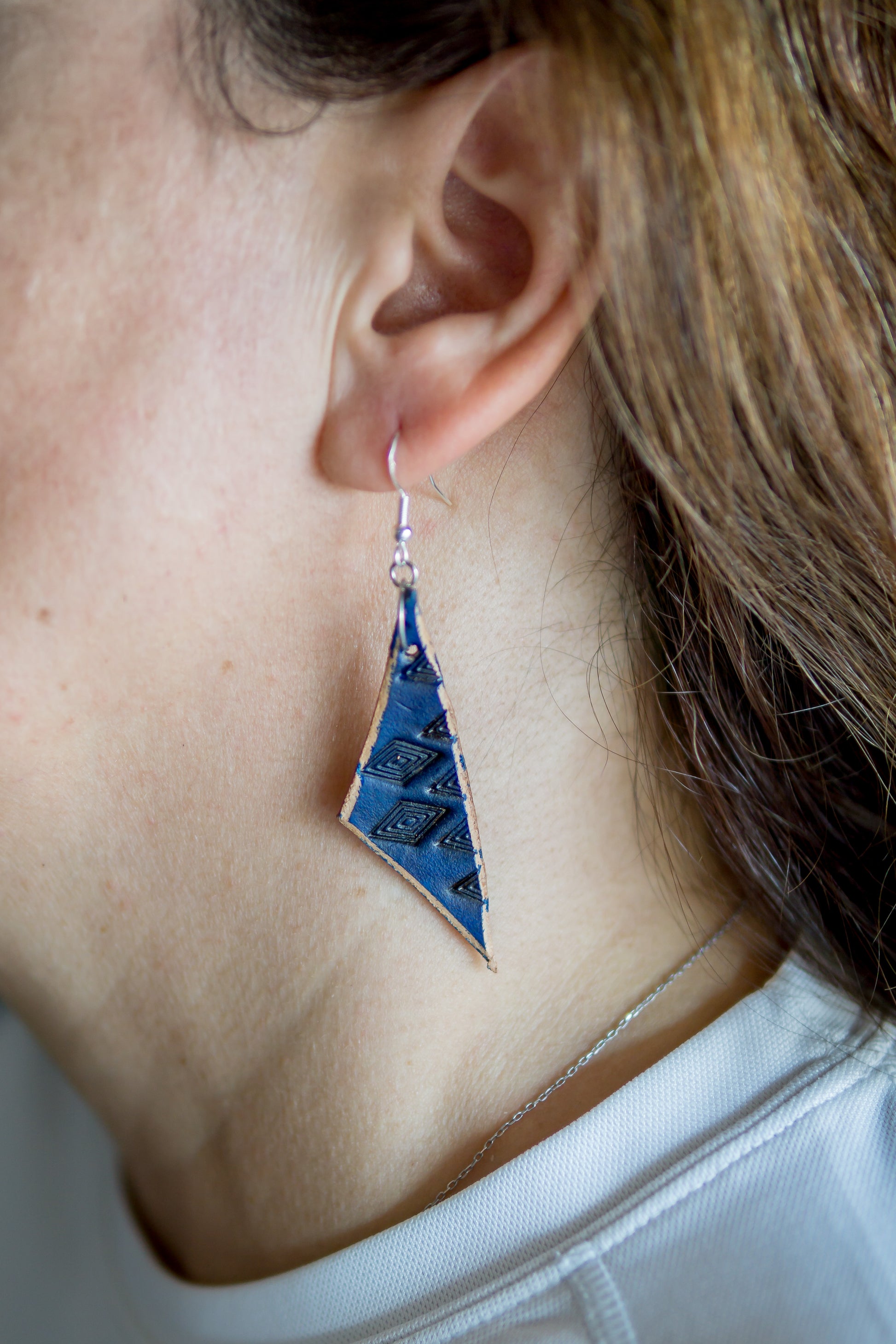 Descobre a ousadia destes brincos artesanais em couro, com um corte assimétrico e acabamento em azul índigo vibrante.