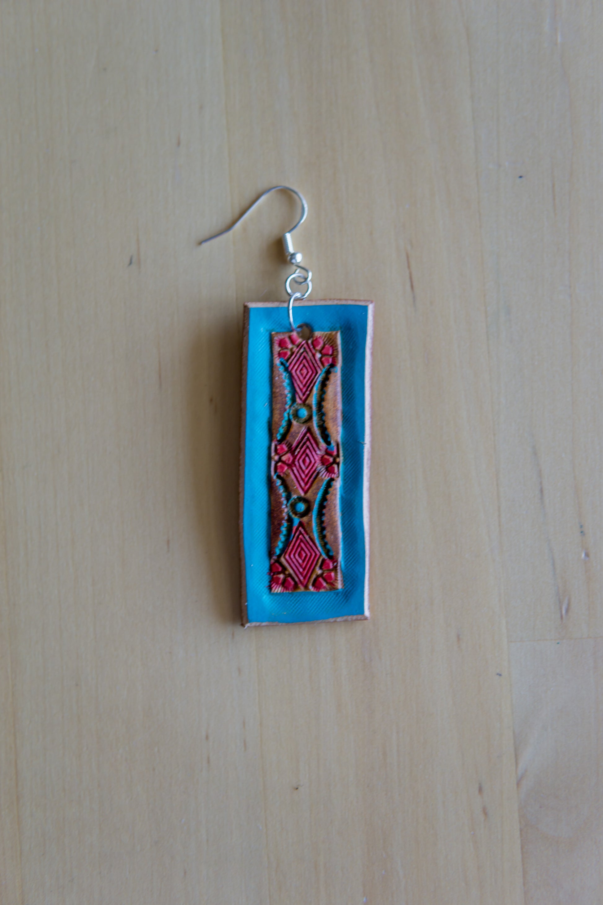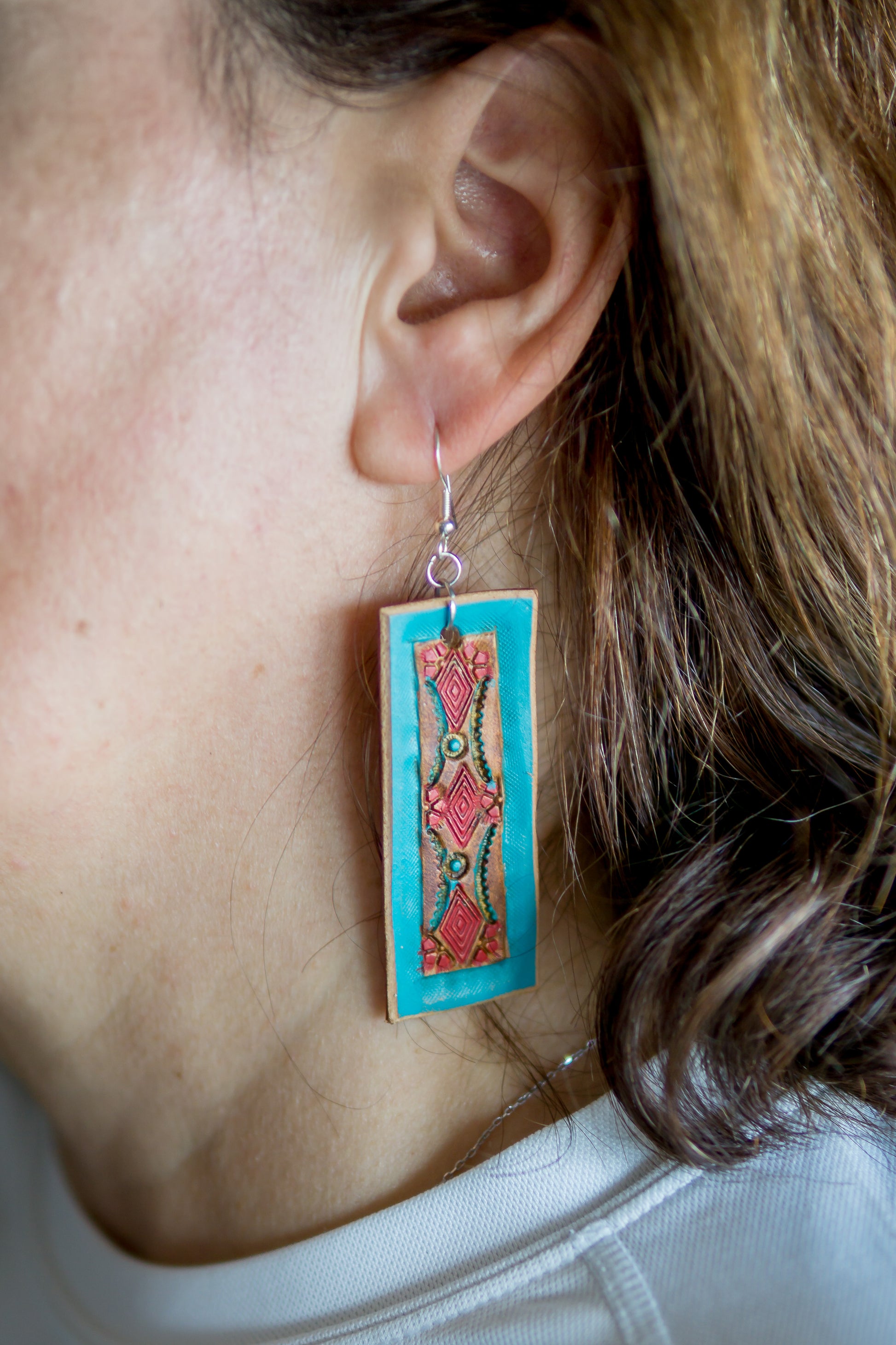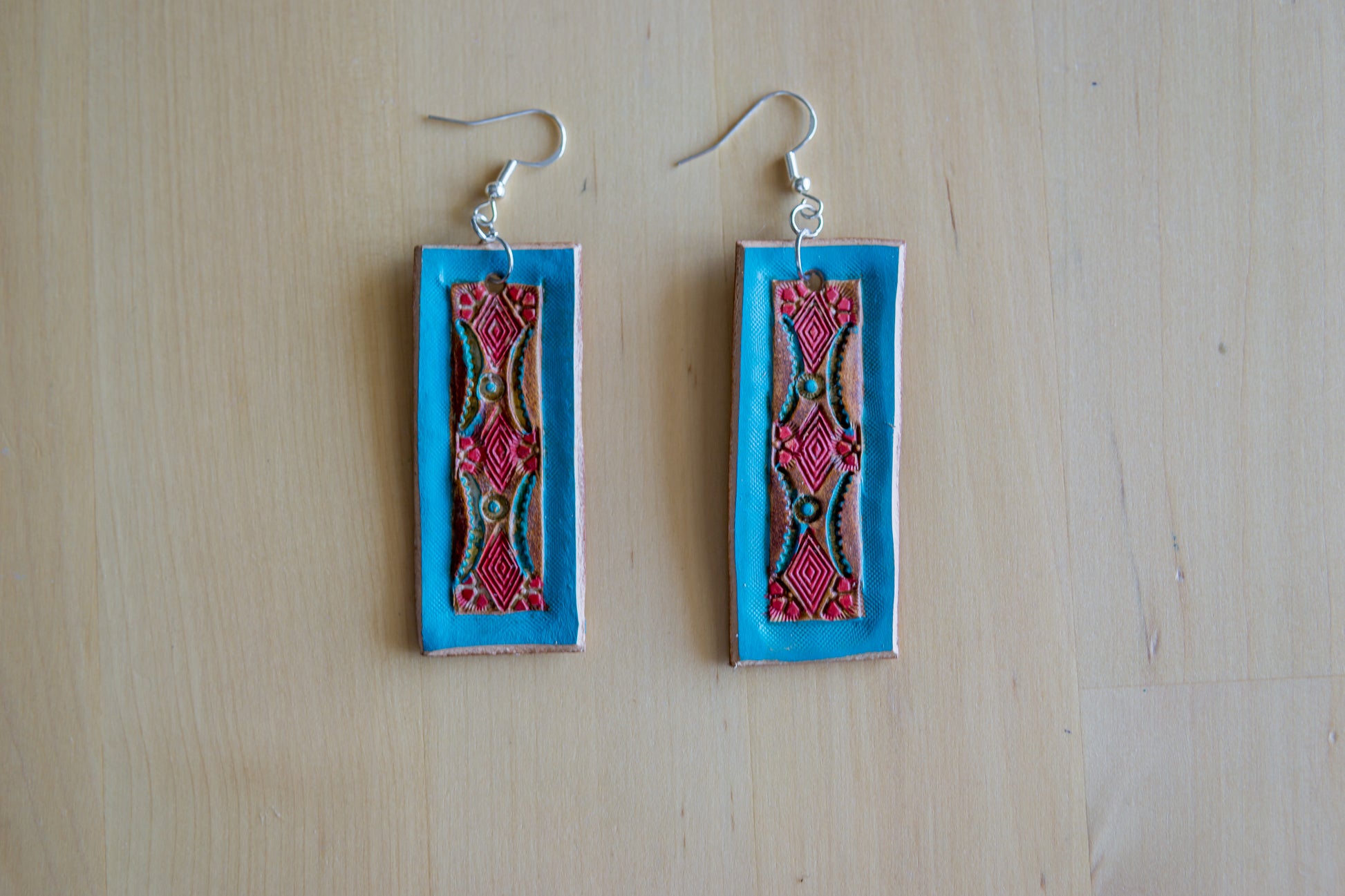 Estes brincos retangulares em couro são uma explosão de cor e energia.