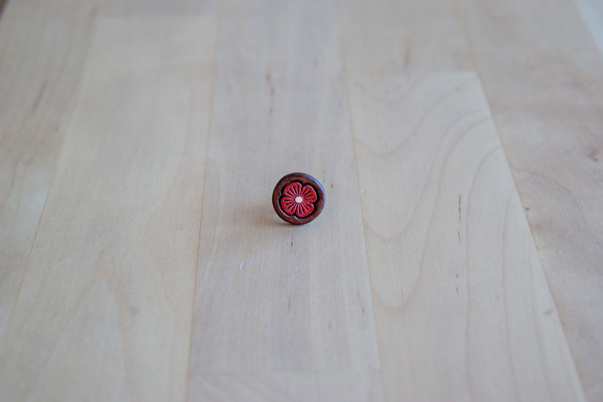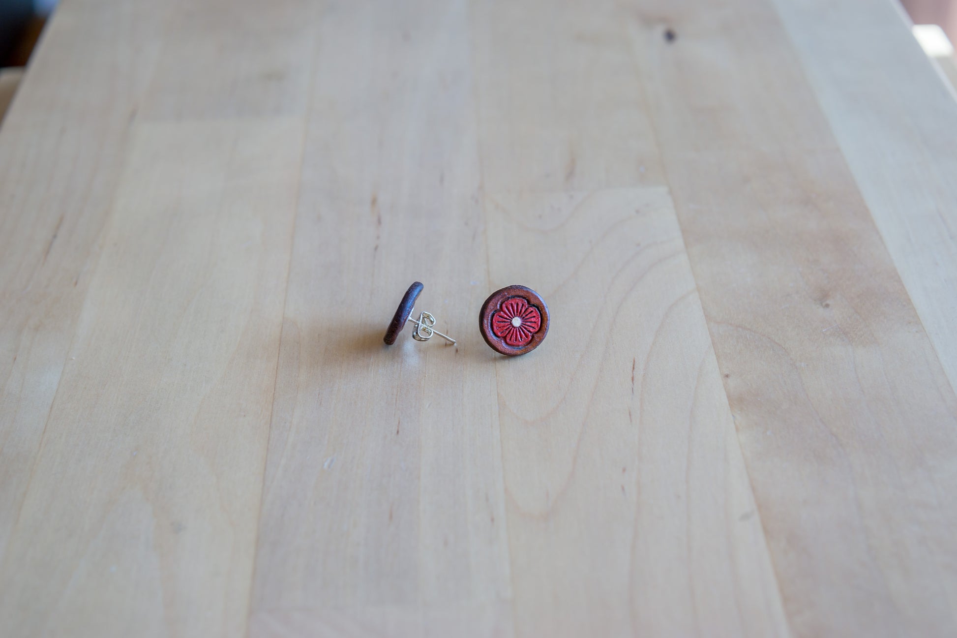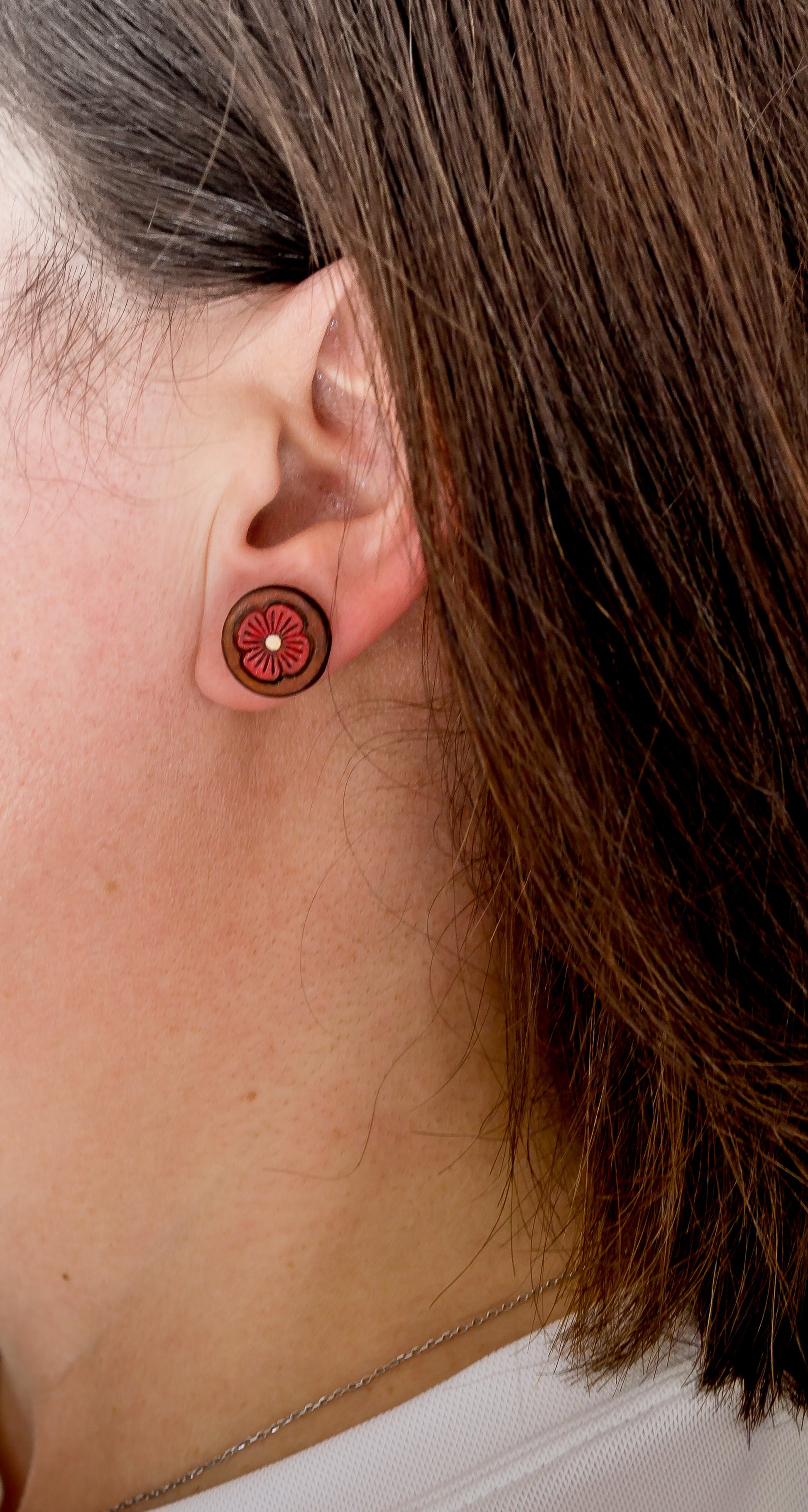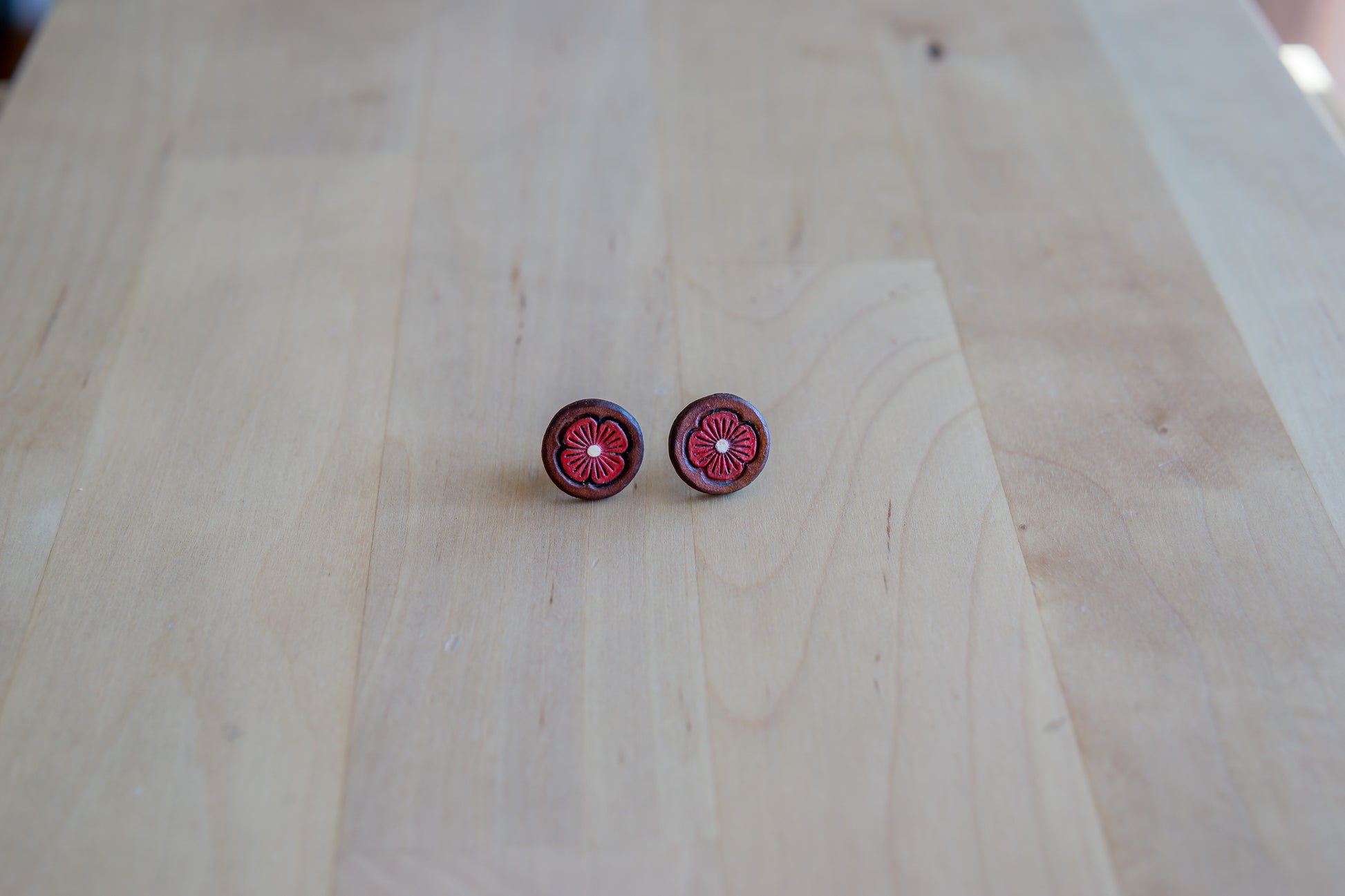 Brincos de Couro com Flor Vermelha Pintada à Mão