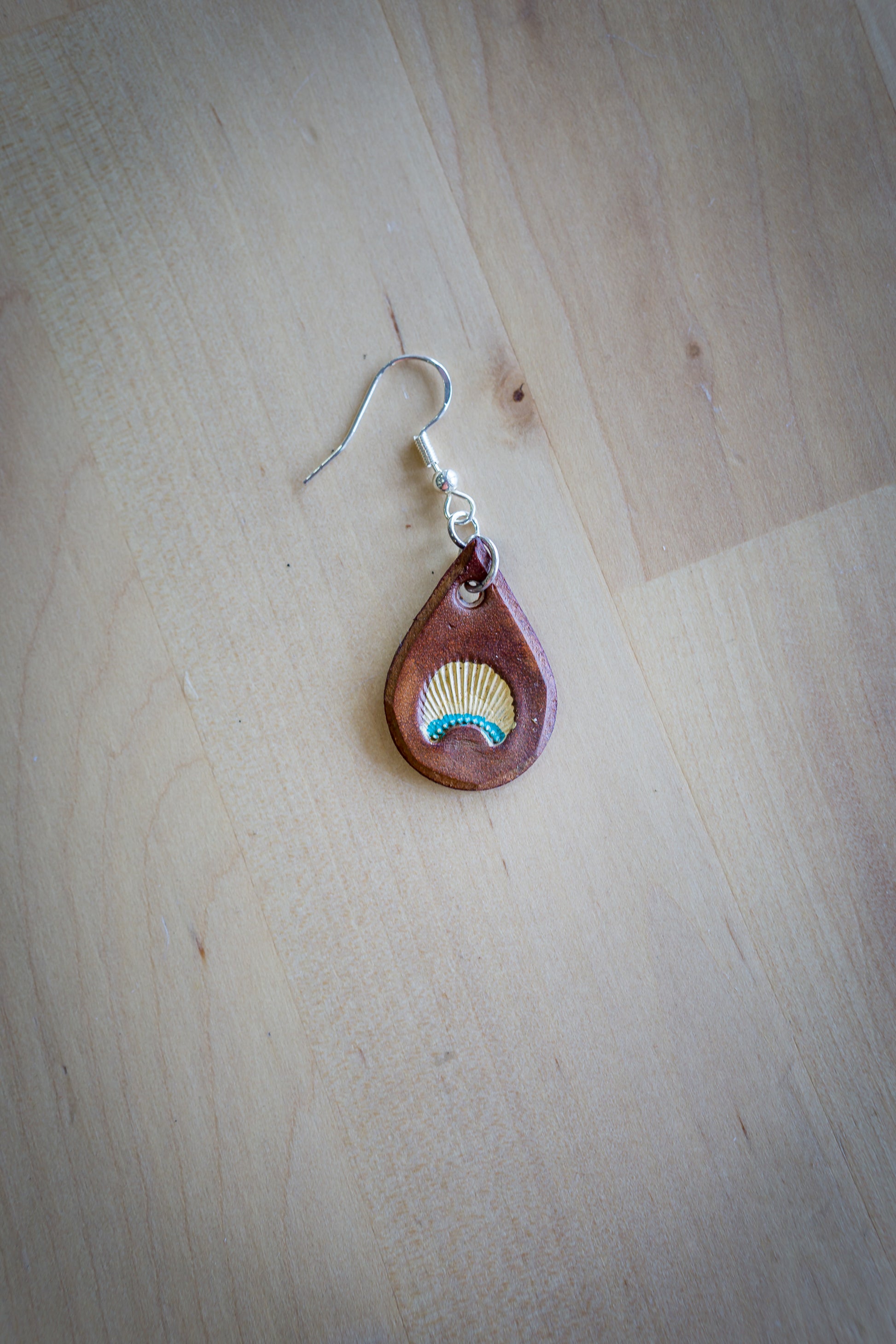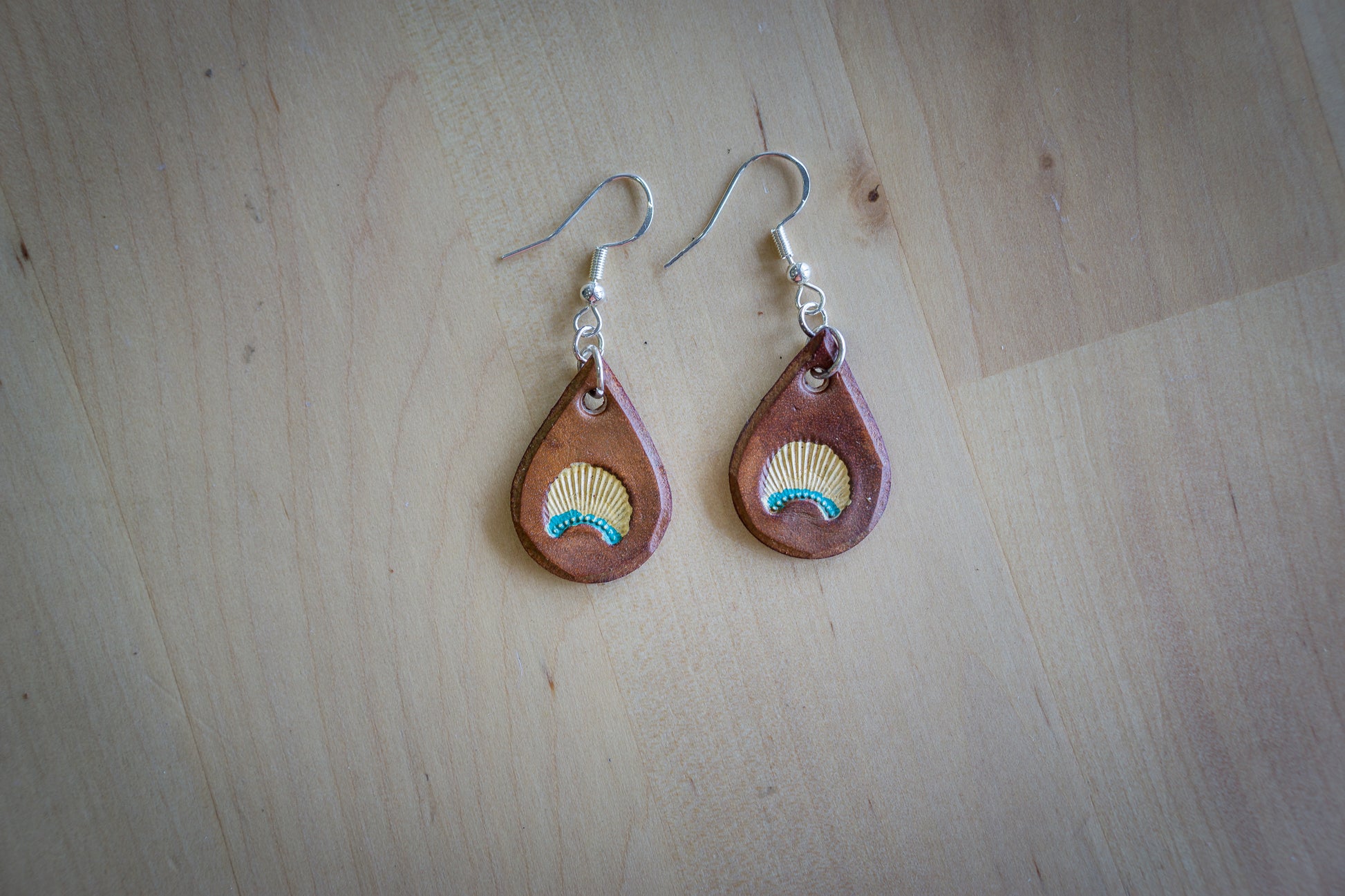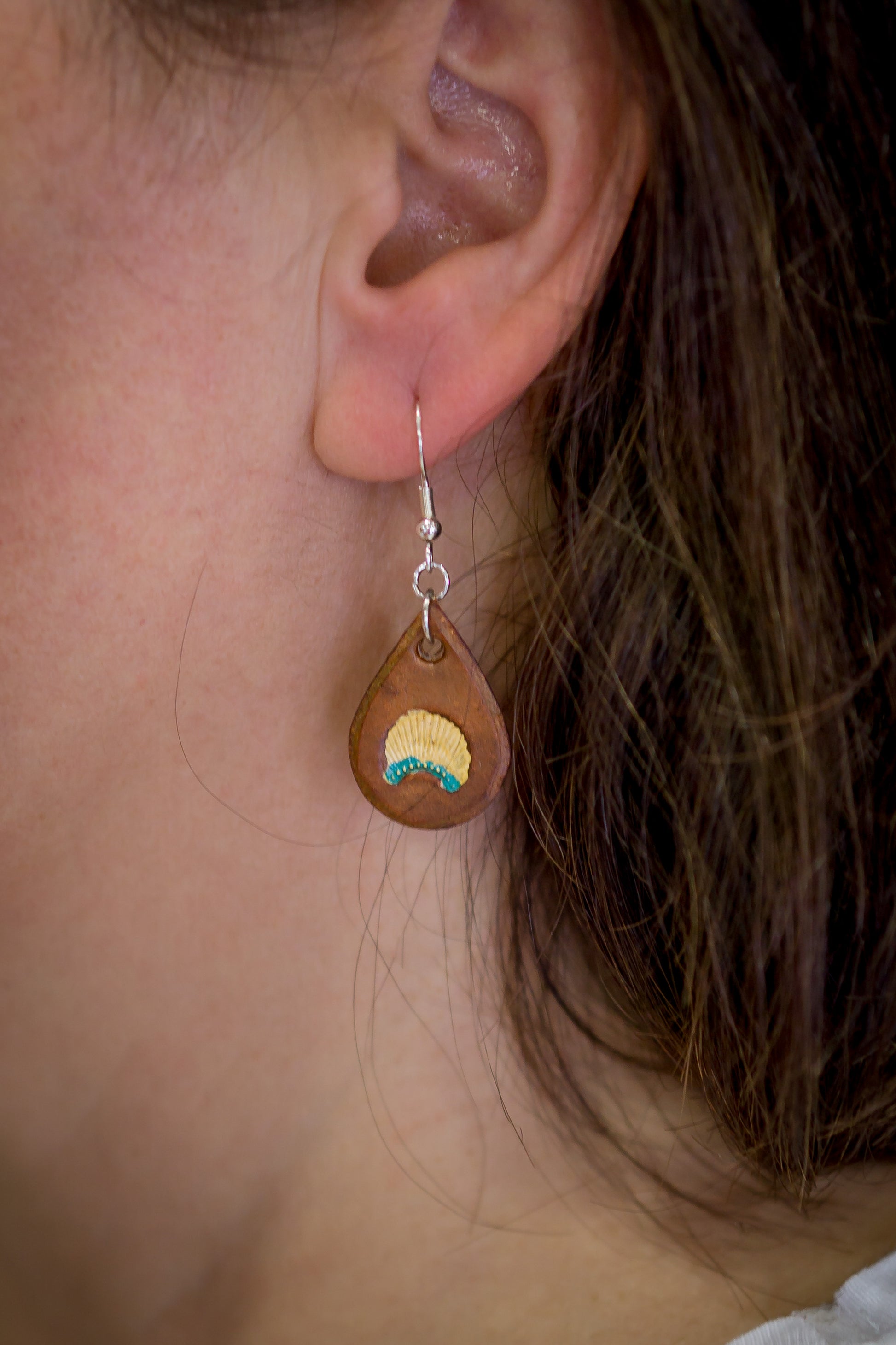 Brincos de Couro em Forma de Gota com Concha Pintada à Mão