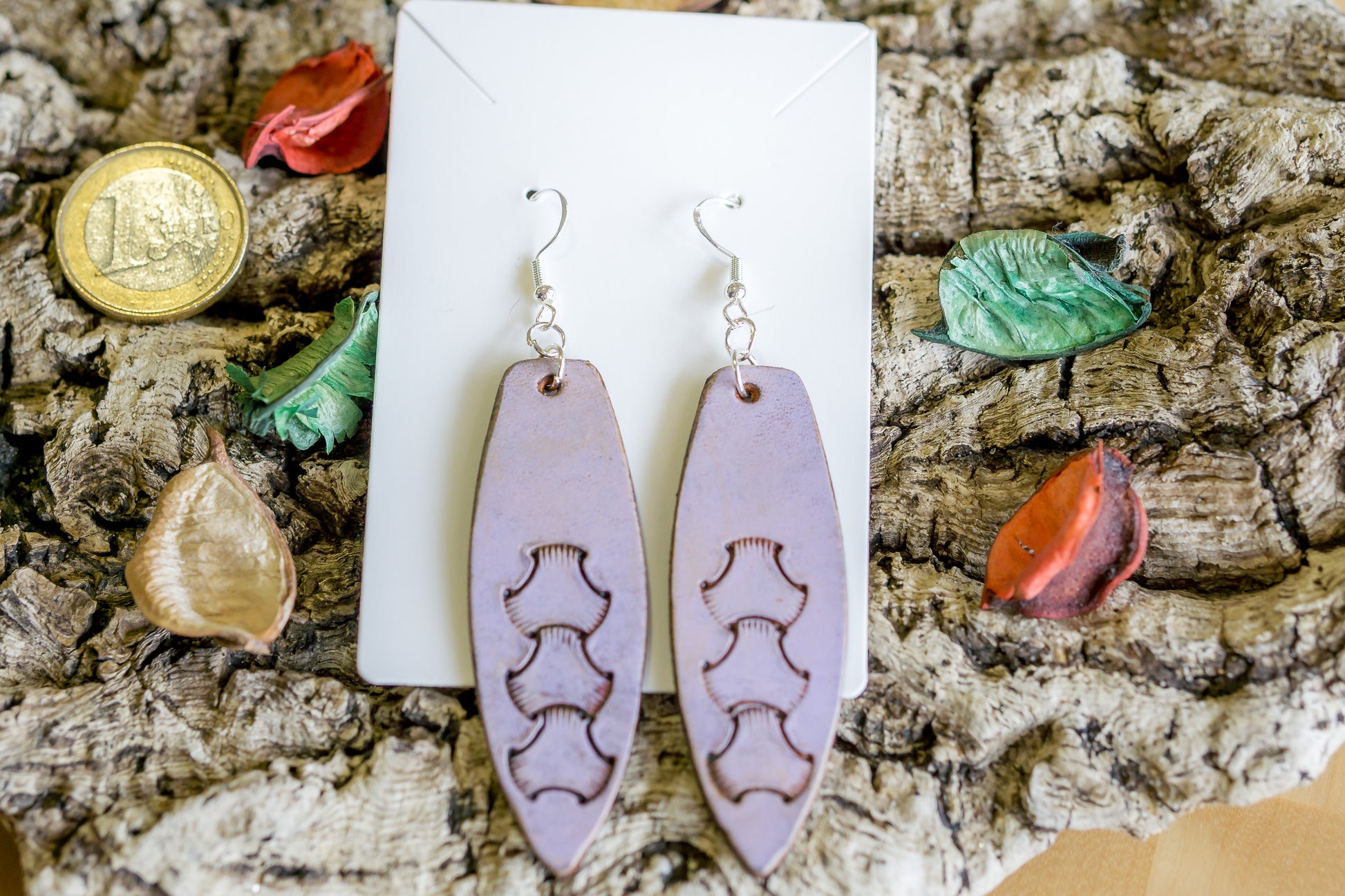 Brincos de couro em formato de prancha de surf feitos à mão na cor lilás