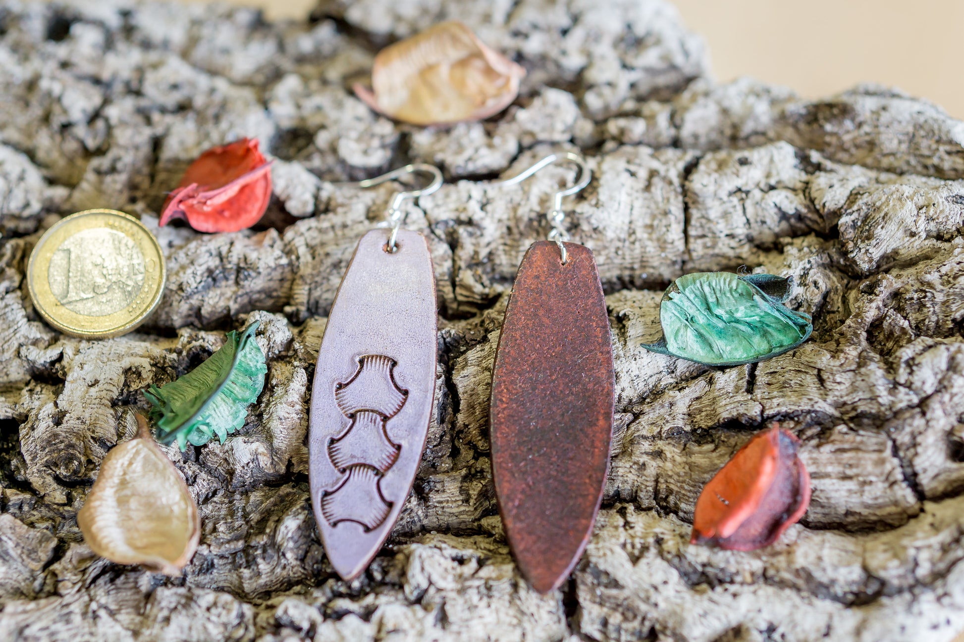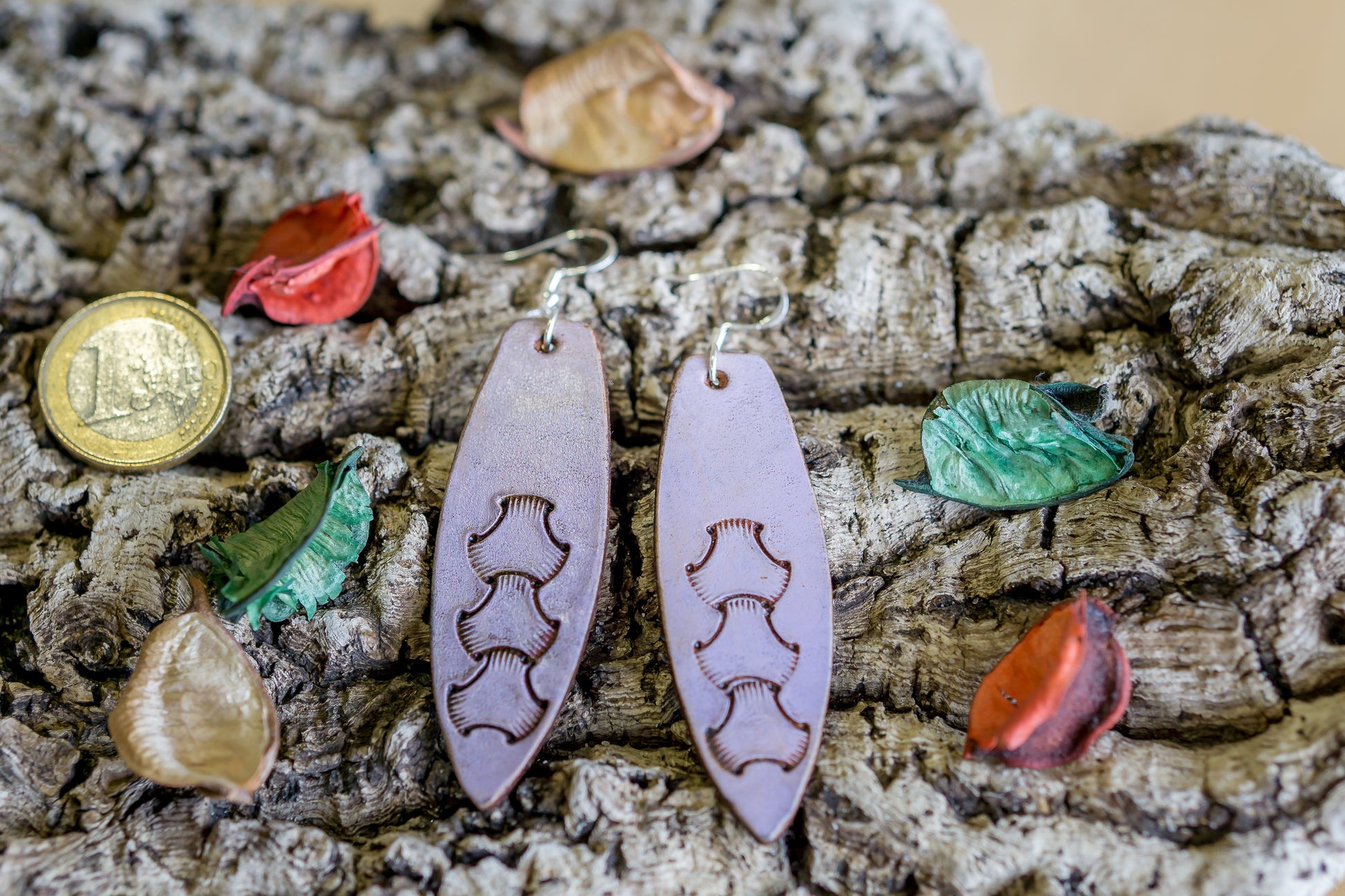 Brincos de couro feitos à mão. Couro de qualidade, curtido de forma tradicional. Feitos manualmente com todo o cuidado e atenção, refletindo-se em cada detalhe. Cada peça é trabalhada manualmente com um design vintage exclusivo e pintada à mão. Os fechos são banhados a prata. O couro envelhece lindamente, ganhando pátina com o uso. Torna-se mais suave ao toque e assume as marcas de uma peça de joalharia amada e usada ao longo do tempo.