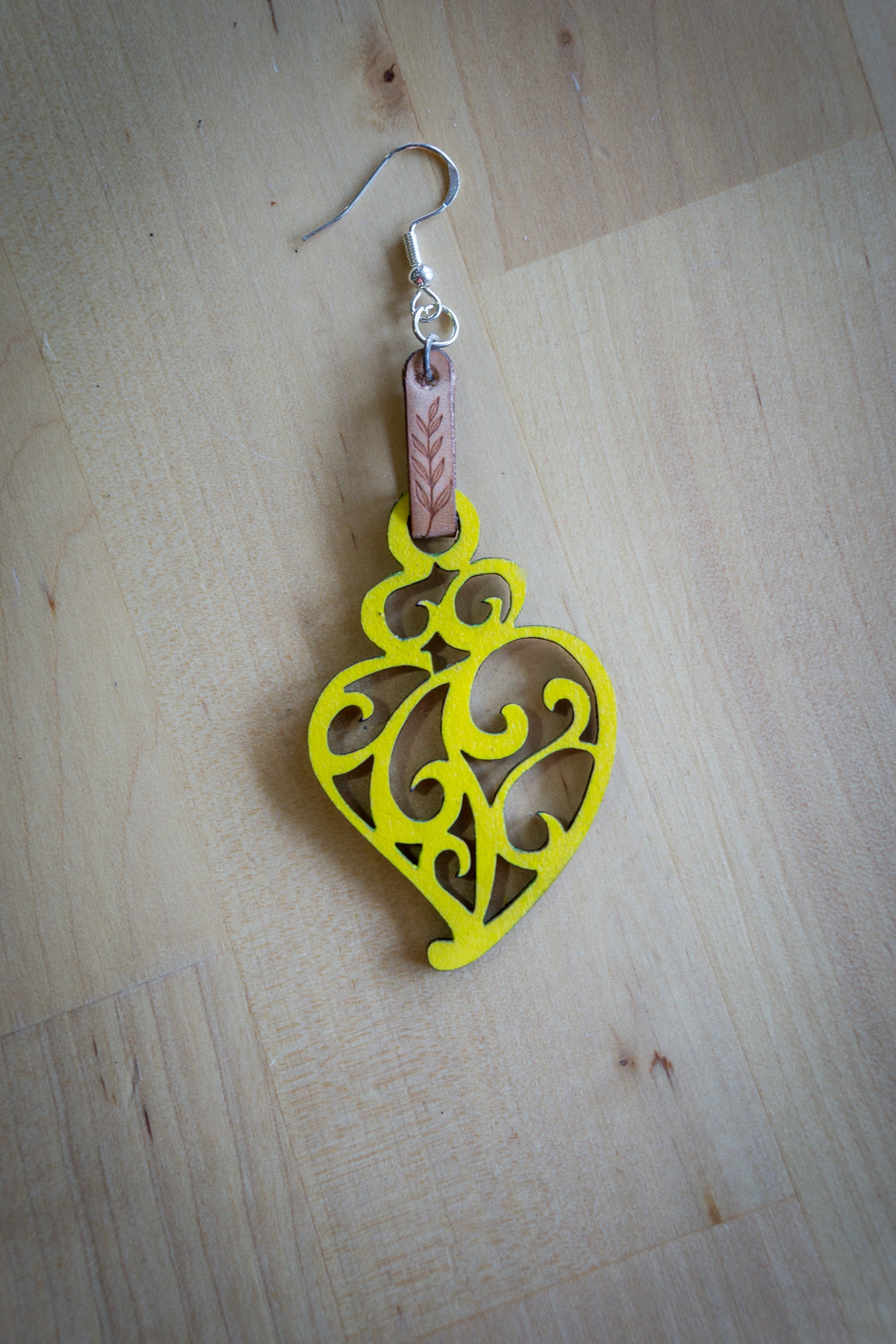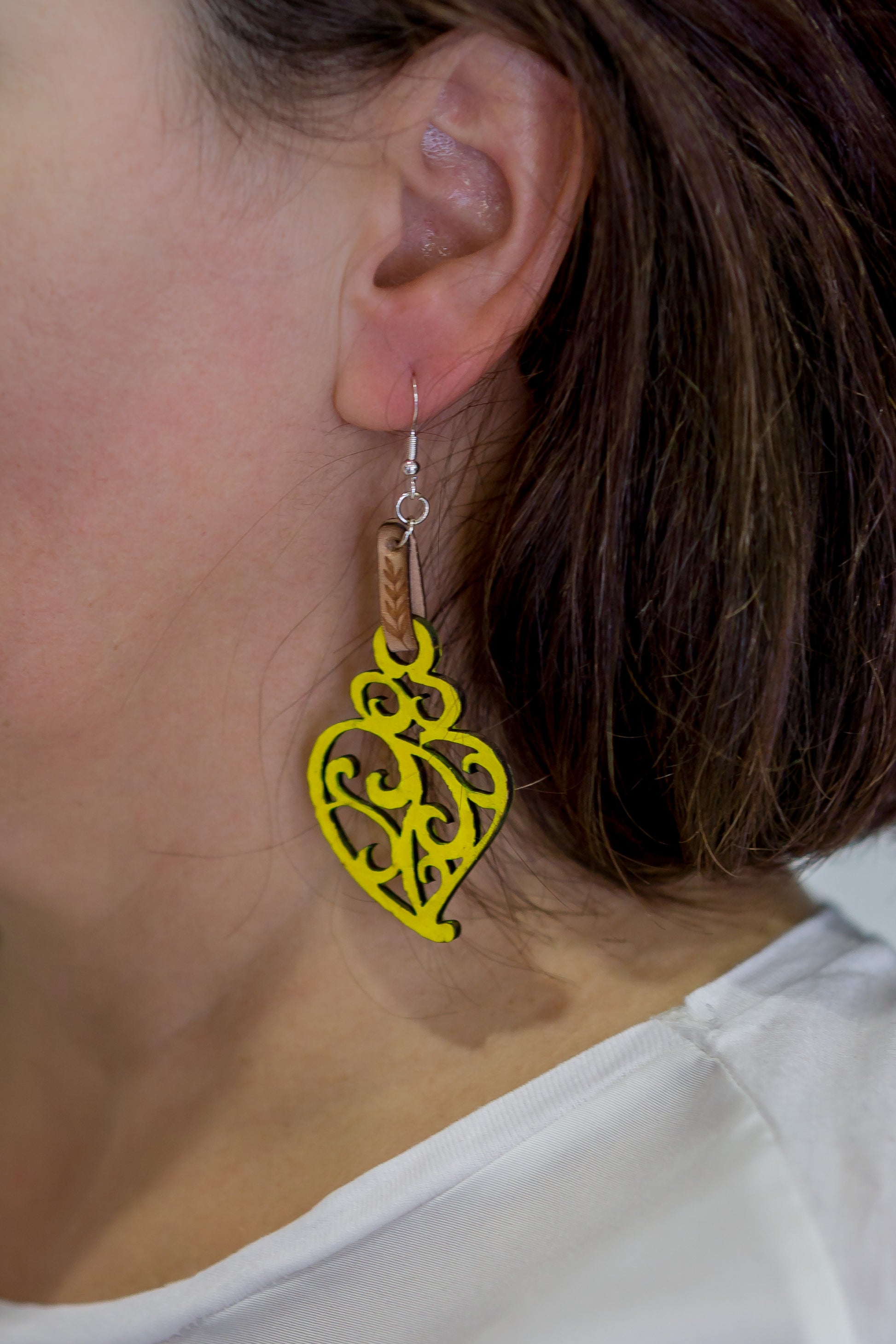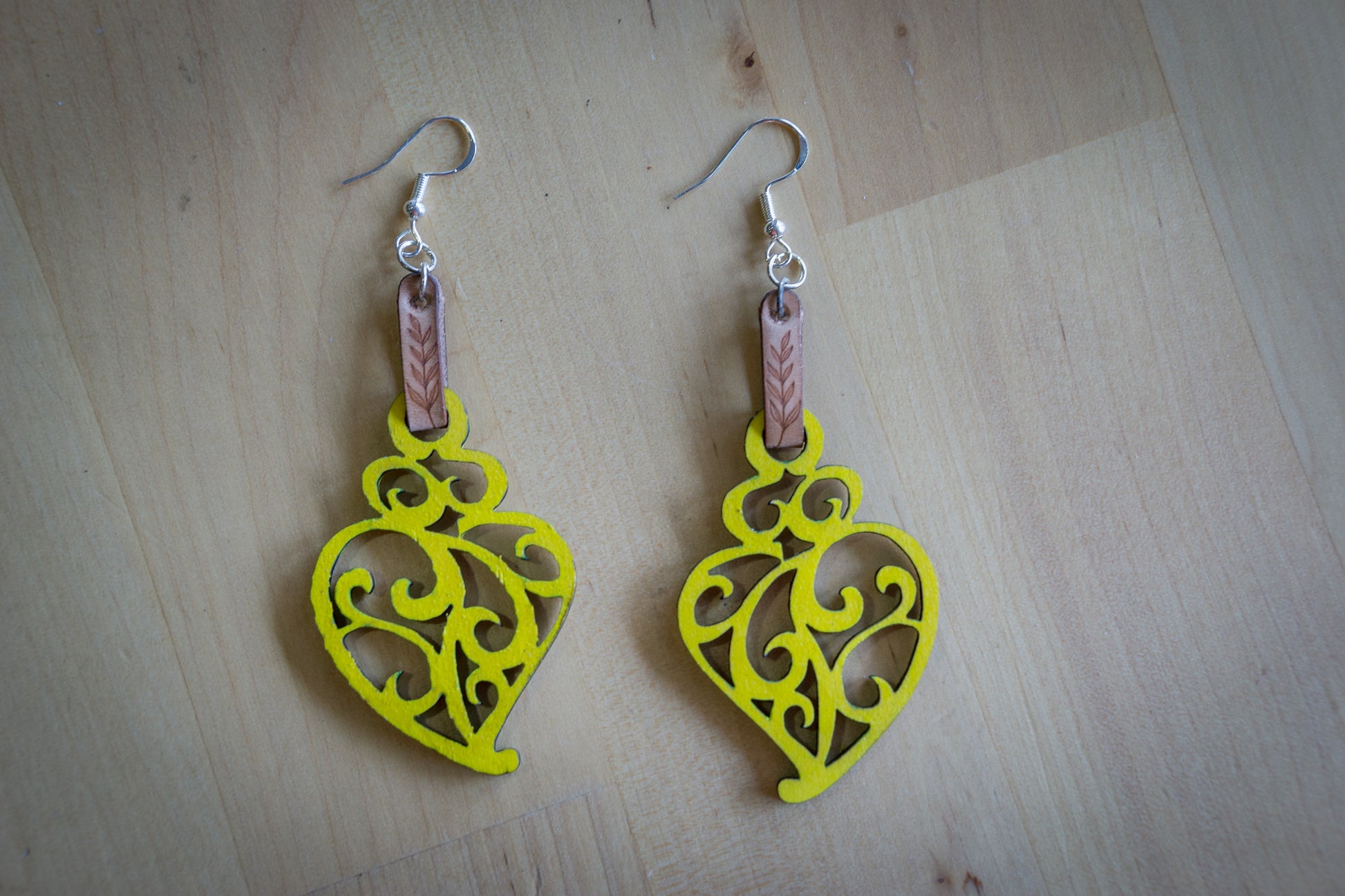 Brincos de Madeira com Coração de Viana, Detalhes em Couro e Realce amarelo
