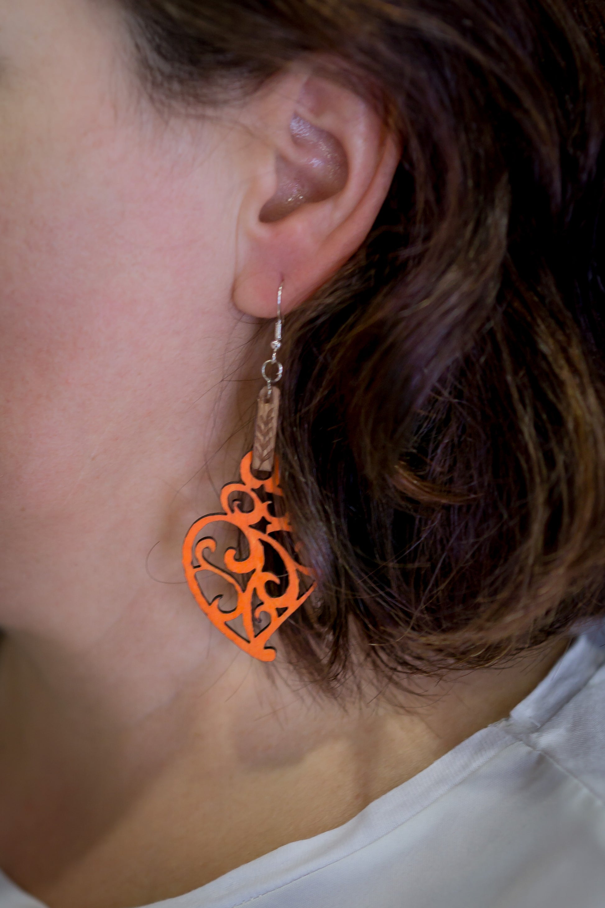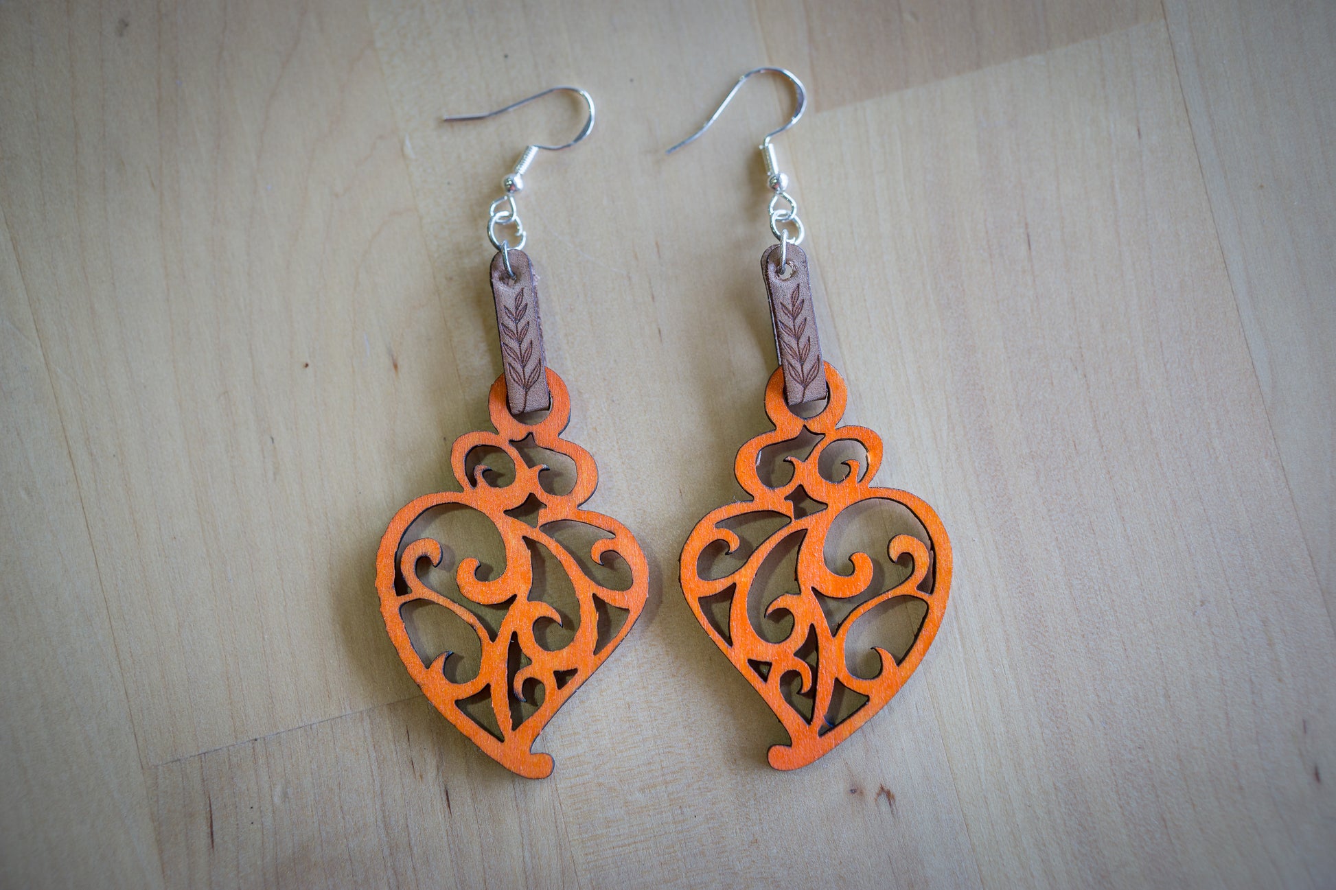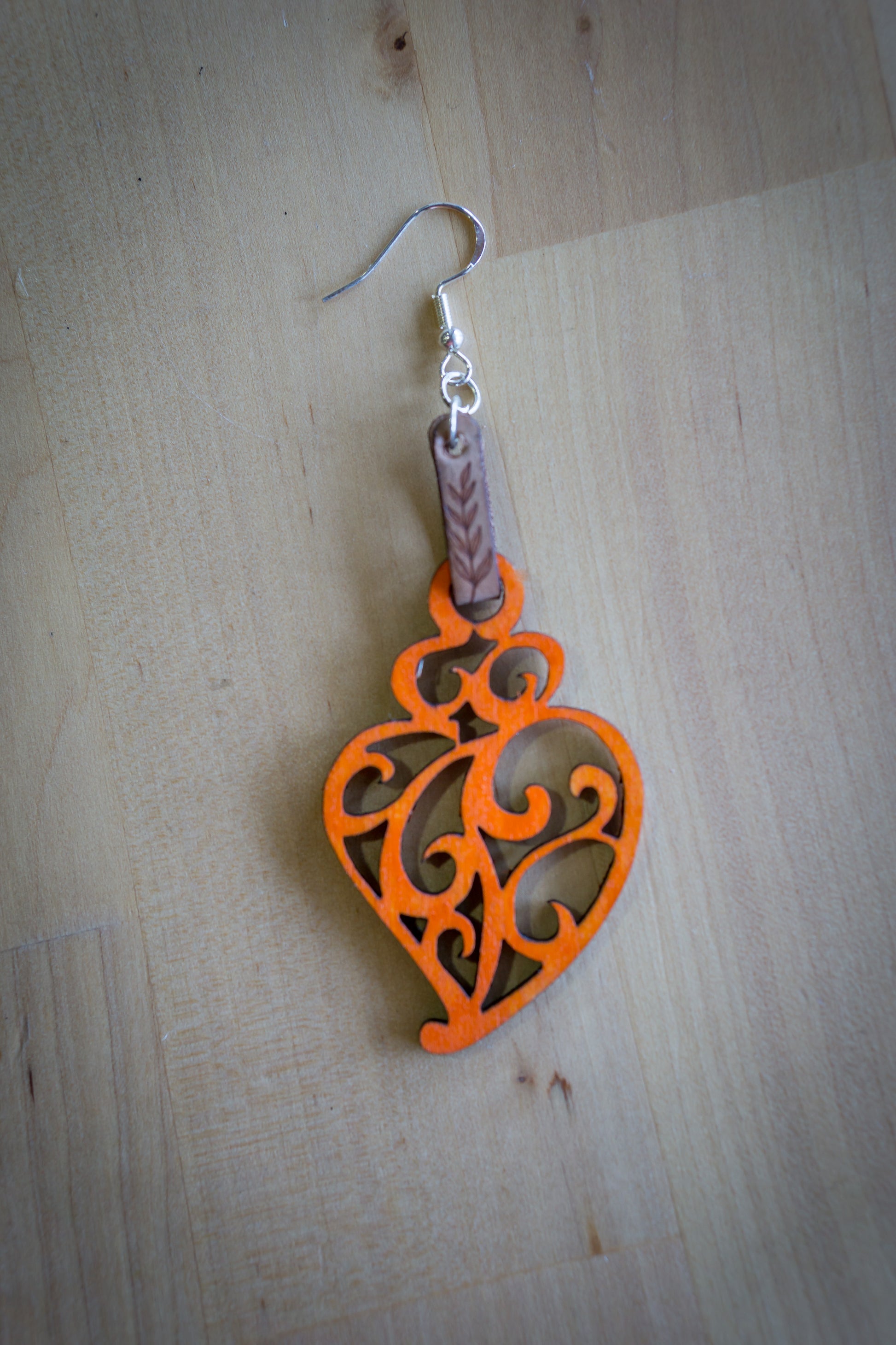 Brincos de Madeira com Coração de Viana, Detalhes em Couro e Realce Laranja