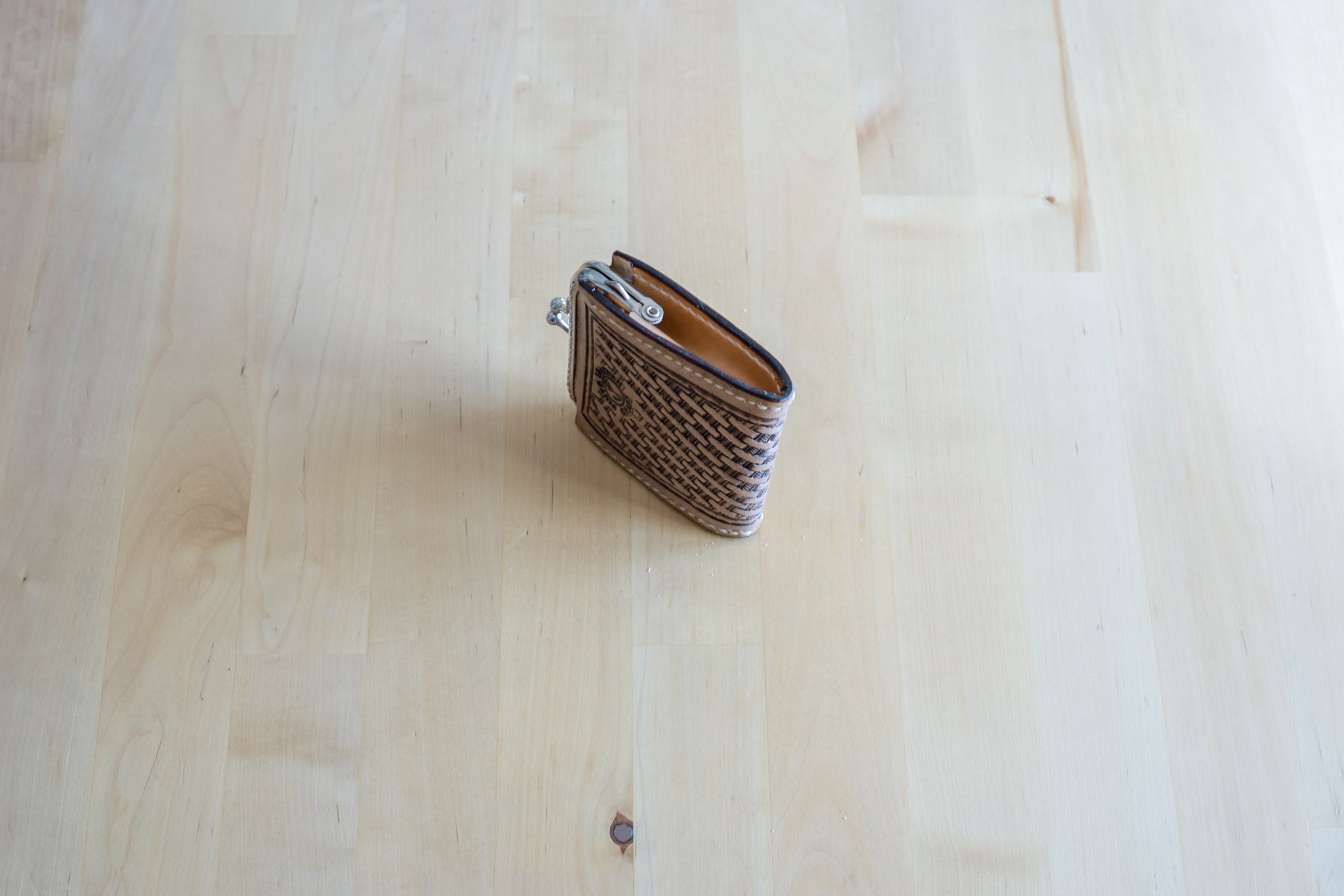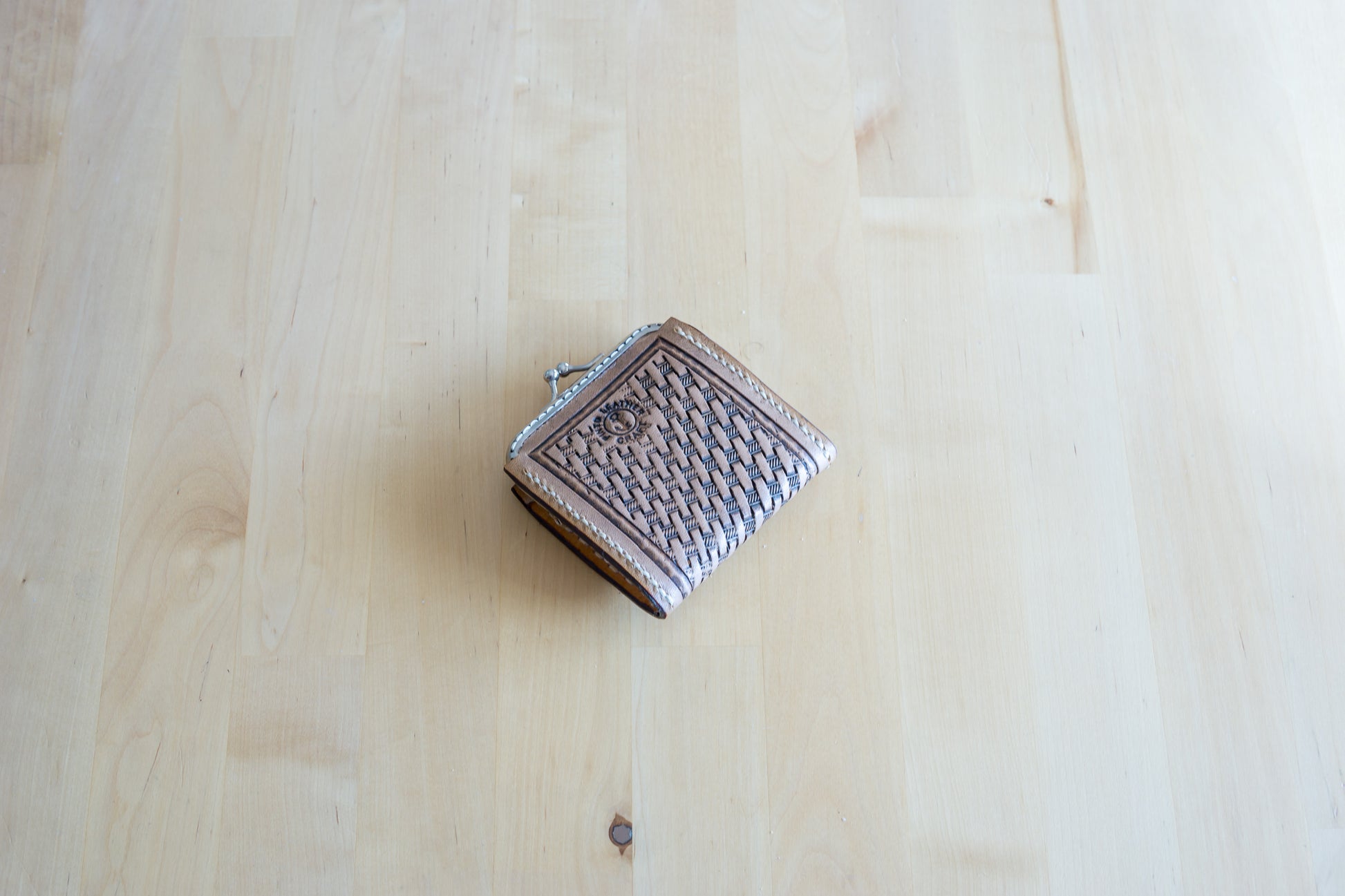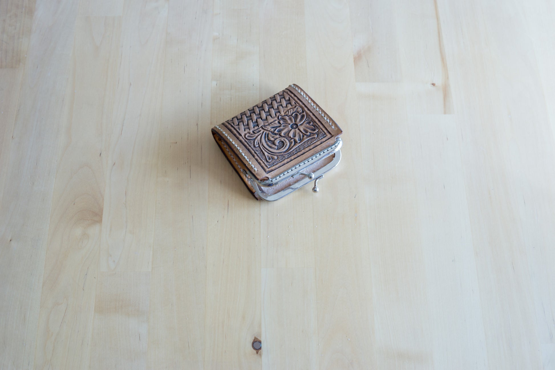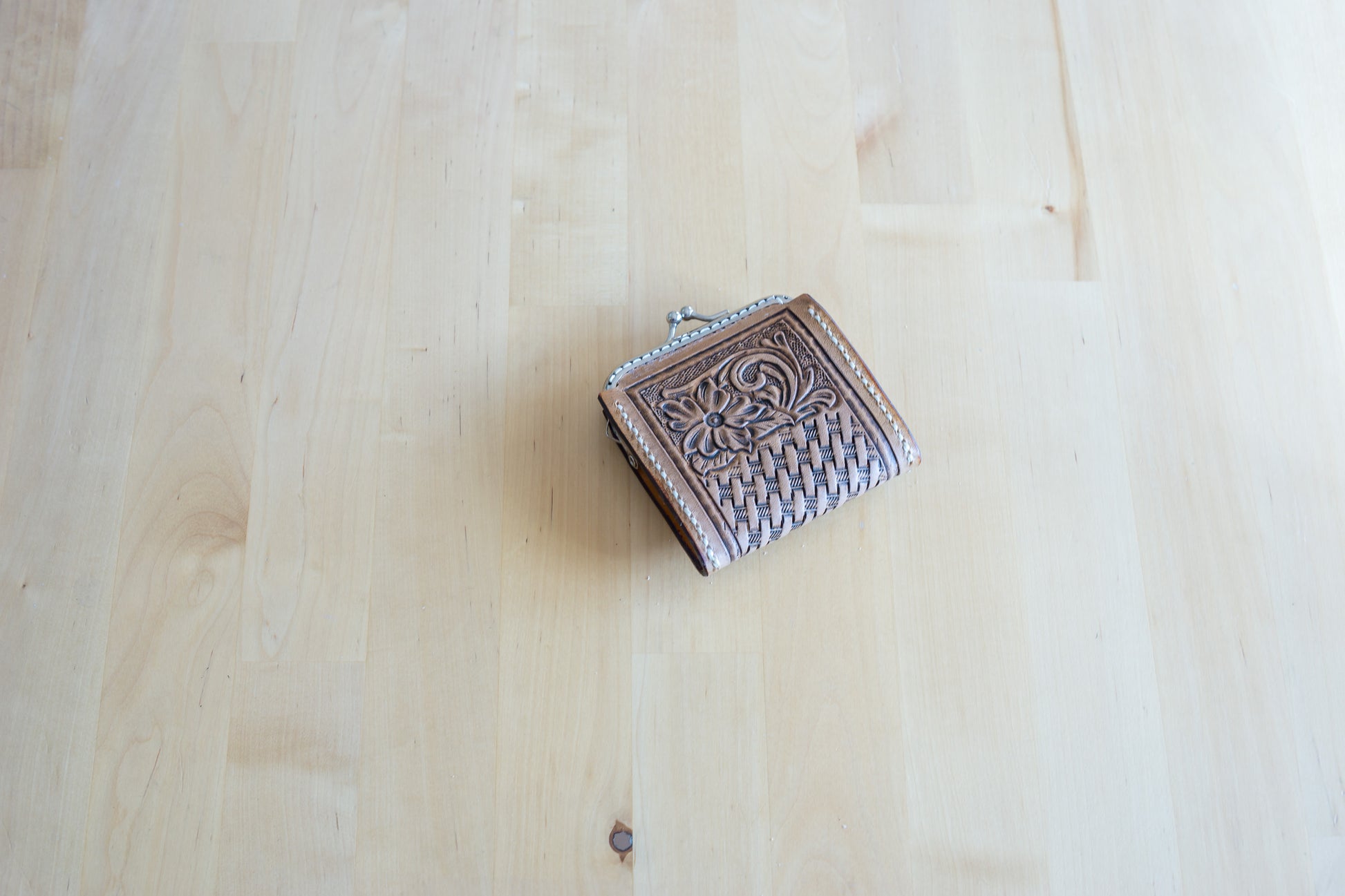 Este porta-moedas em couro vegetal apresenta um padrão de flor clássica esculpido à mão, refletindo técnicas artesanais intemporais.