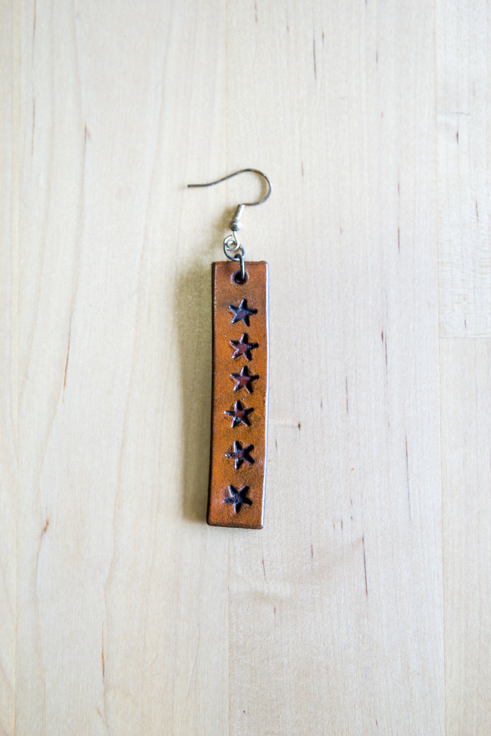 Brincos artesanais de couro formato barra – motivos abstratos laranja