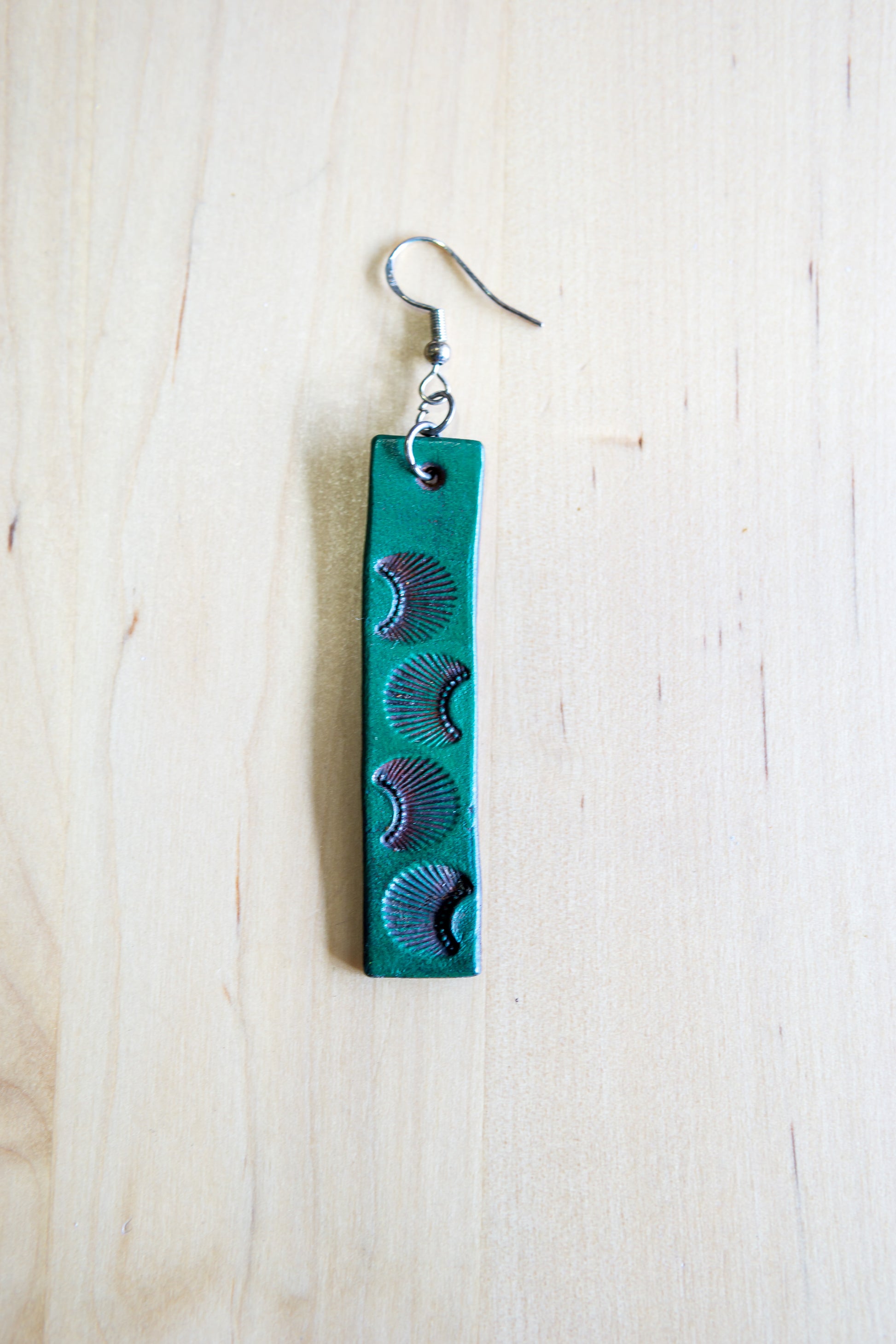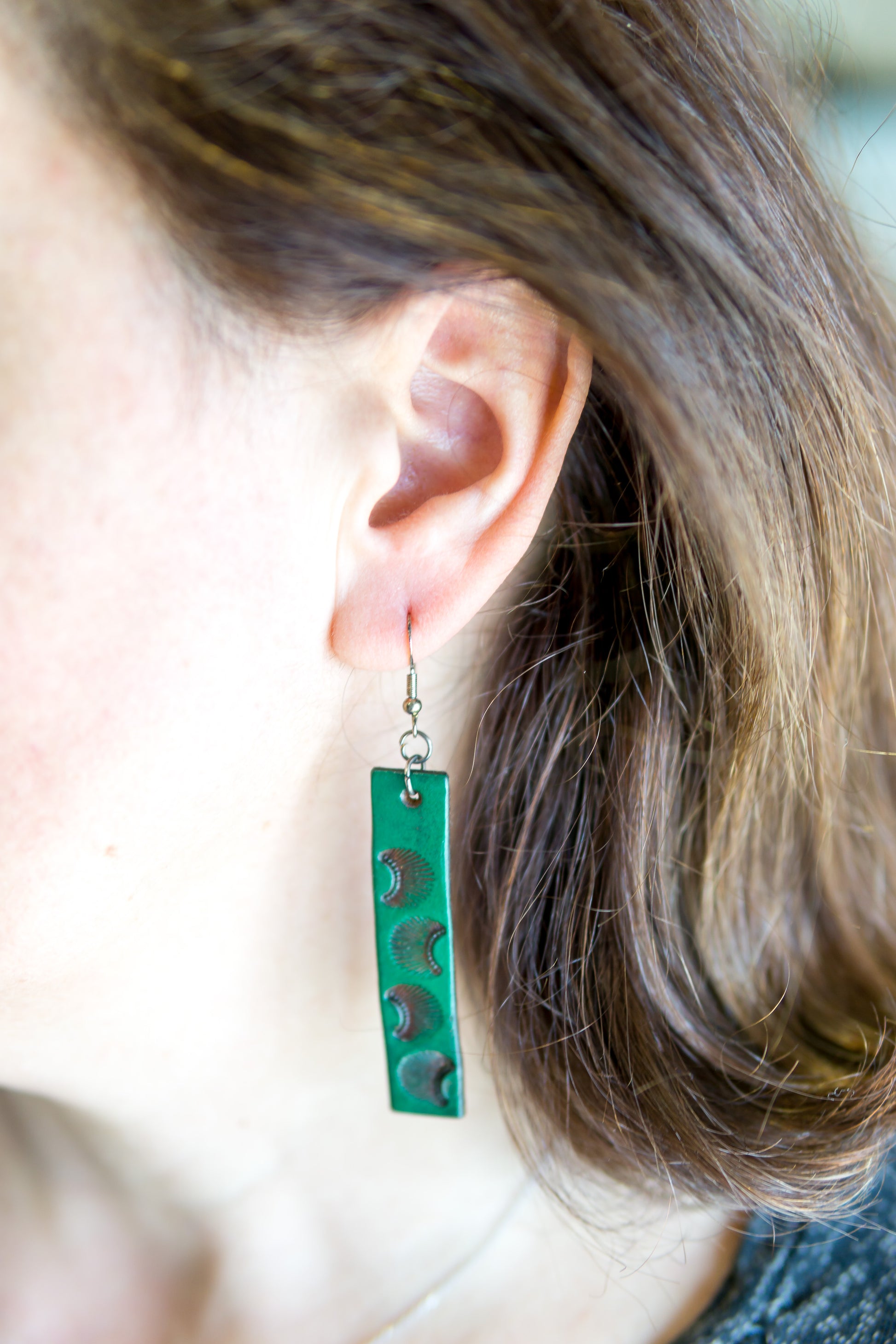 Brincos artesanais de couro formato barra – motivos abstratos verdes