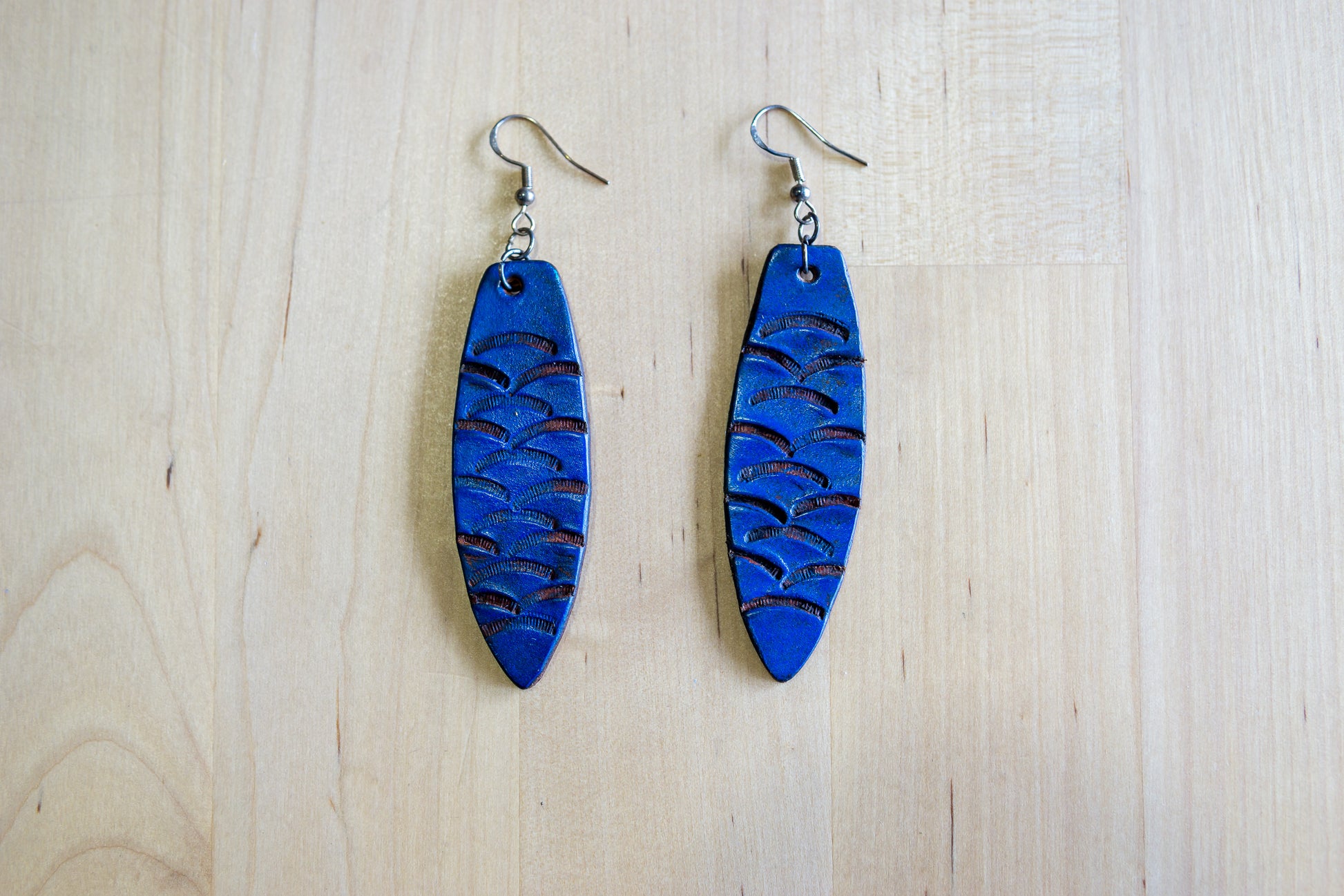Dê estilo e personalidade ao seu look com estes brincos artesanais em couro genuíno de 2 mm de espessura, moldados no formato criativo de uma prancha de surf e decorados com motivos abstratos feitos à mão na cor azul.