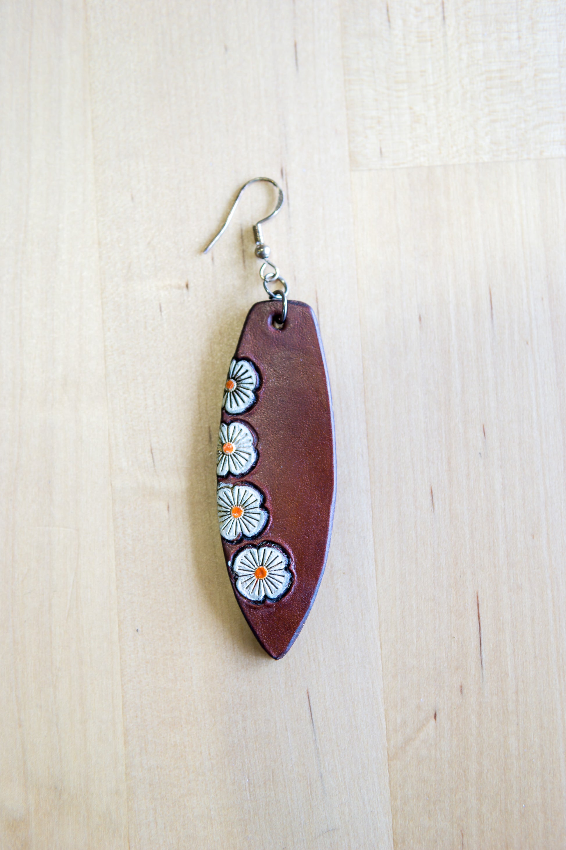 Brincos Artesanais em Couro – Prancha de Surf com Motivos Florais (Branco)