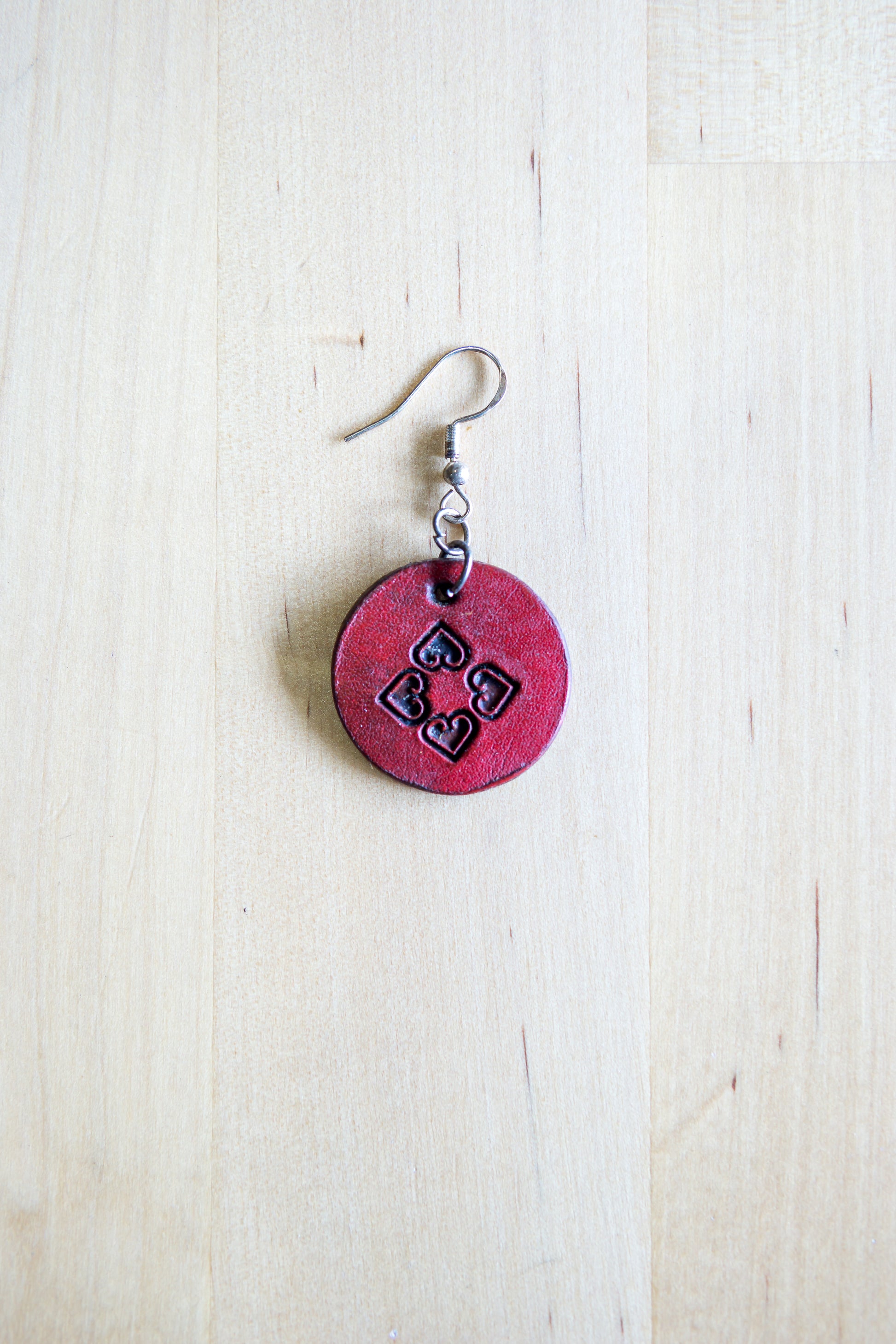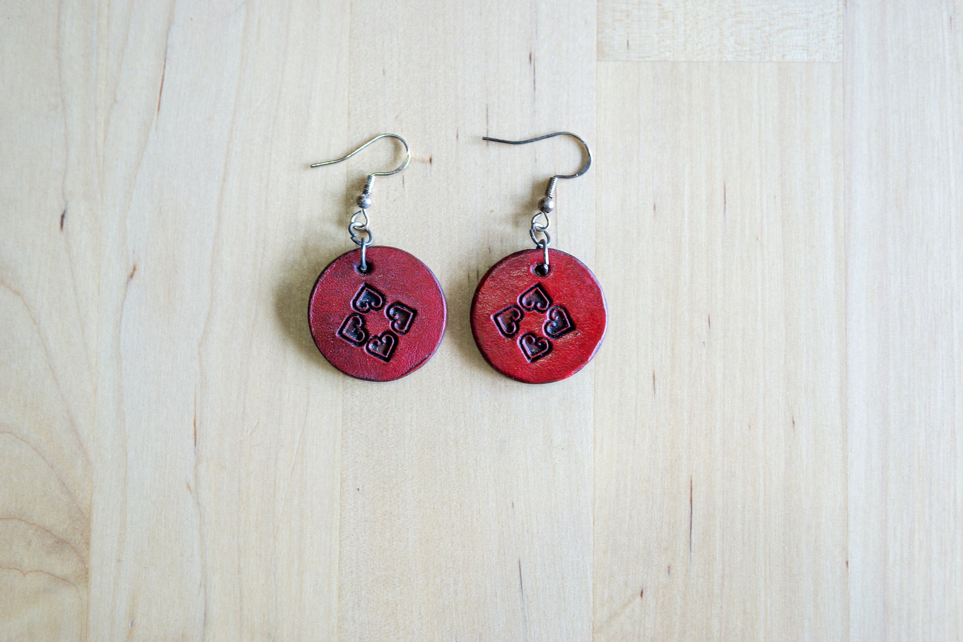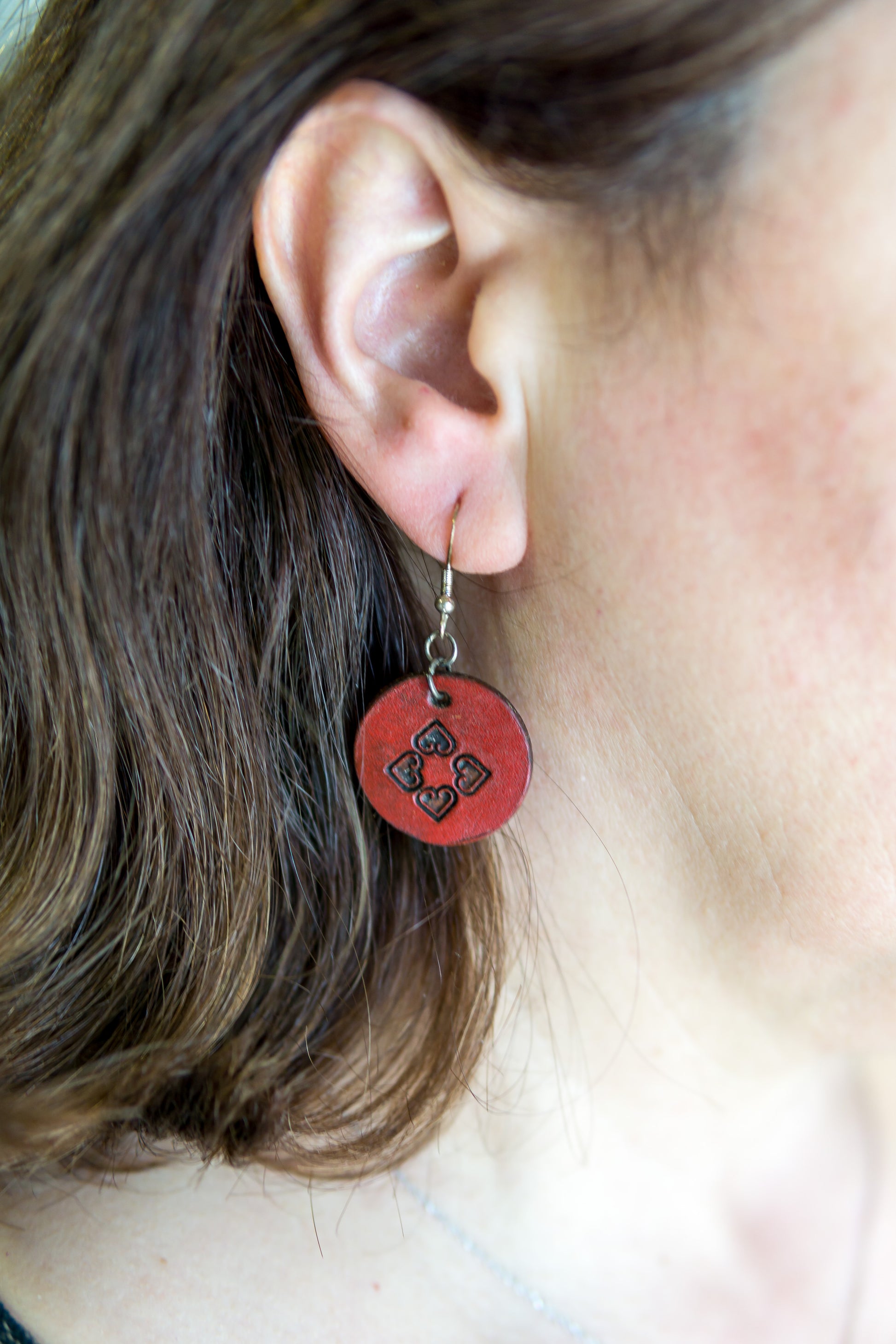 Brincos artesanais em couro redondos – motivos abstratos vermelhos