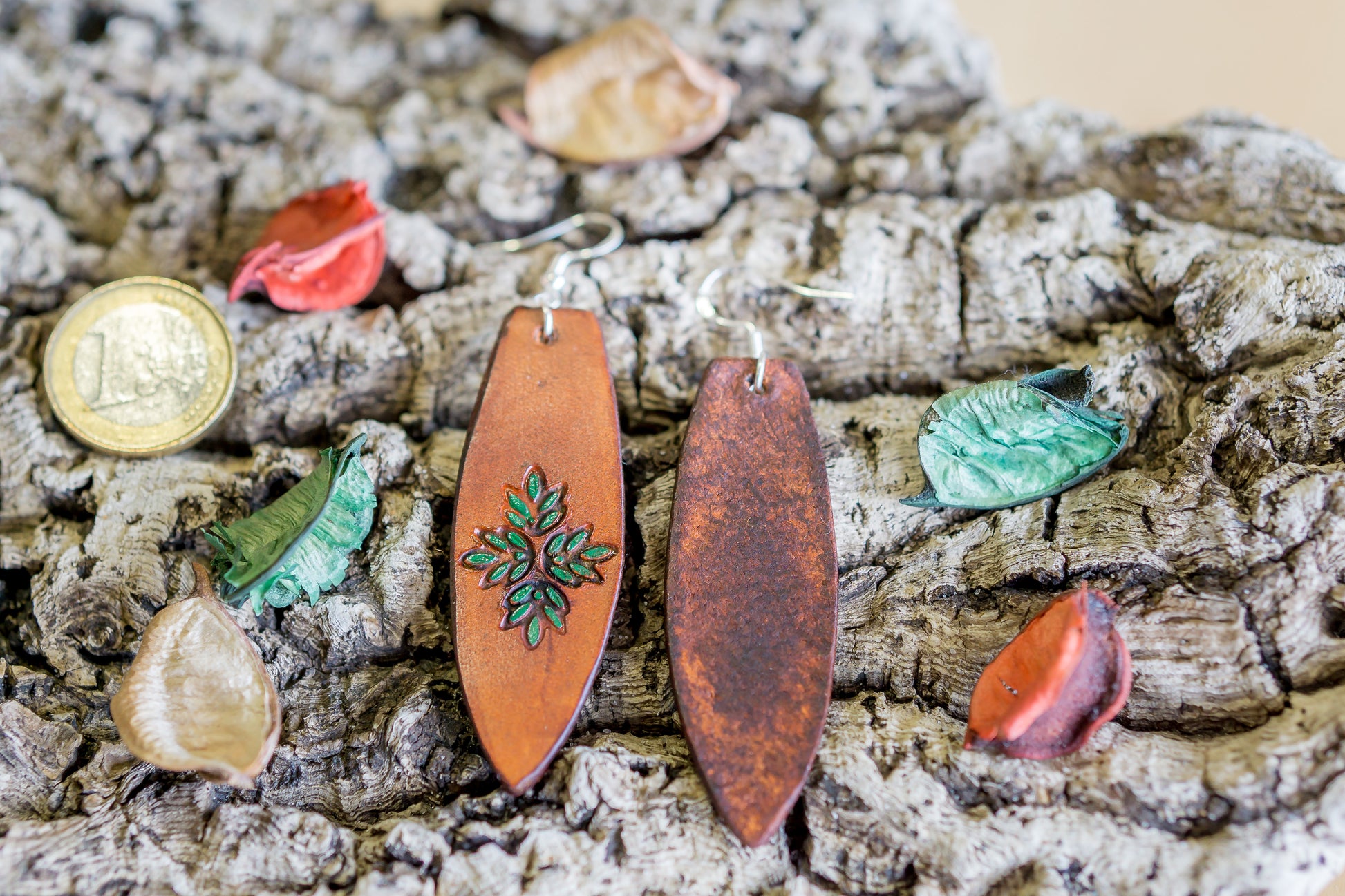 Brincos de couro feitos à mão. Couro de qualidade, curtido de forma tradicional. Feitos manualmente com todo o cuidado e atenção, refletindo-se em cada detalhe. Cada peça é trabalhada manualmente com um design vintage exclusivo e pintada à mão. Os fechos são banhados a prata. O couro envelhece lindamente, ganhando pátina com o uso. Torna-se mais suave ao toque e assume as marcas de uma peça de joalharia amada e usada ao longo do tempo.