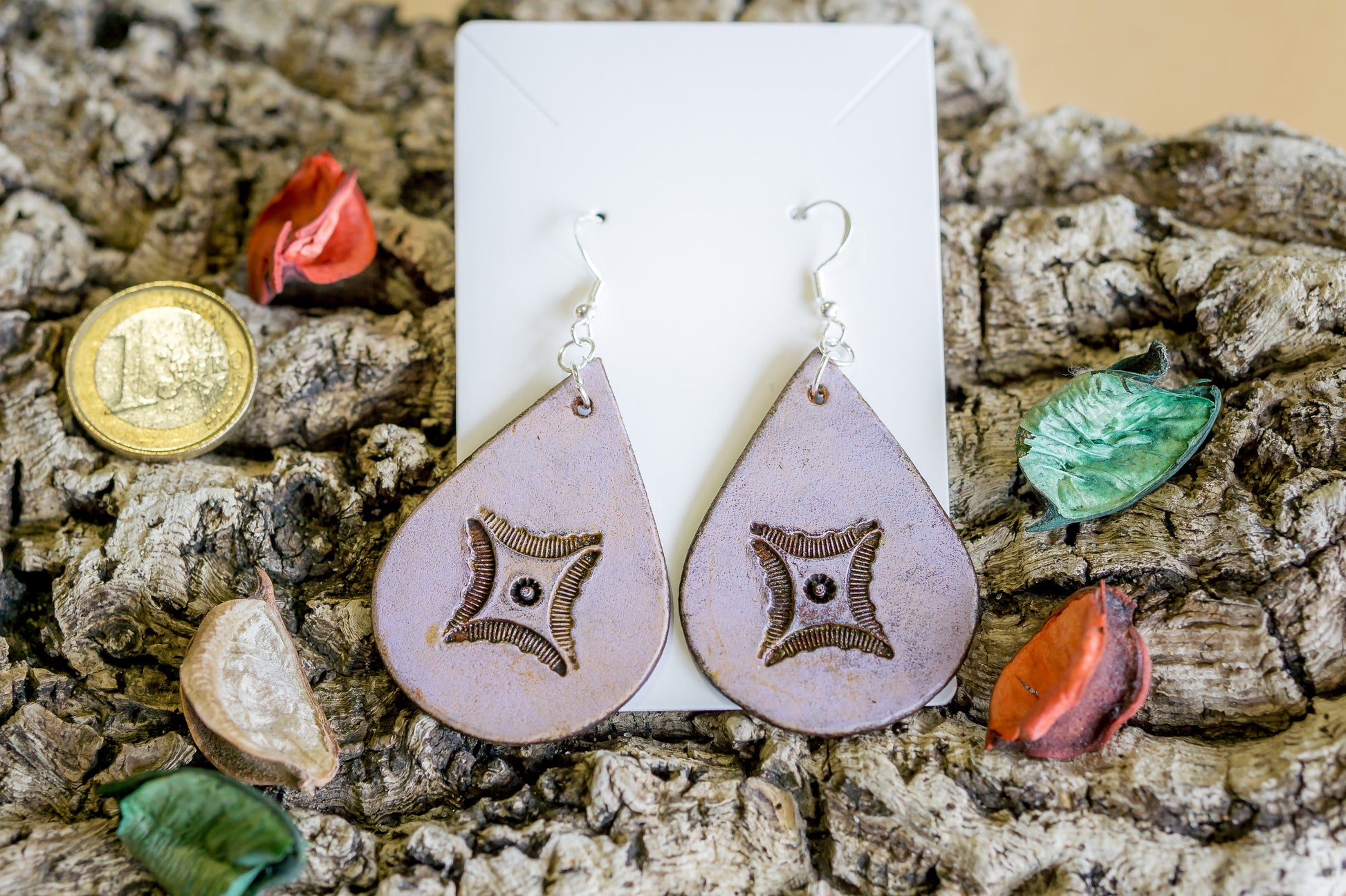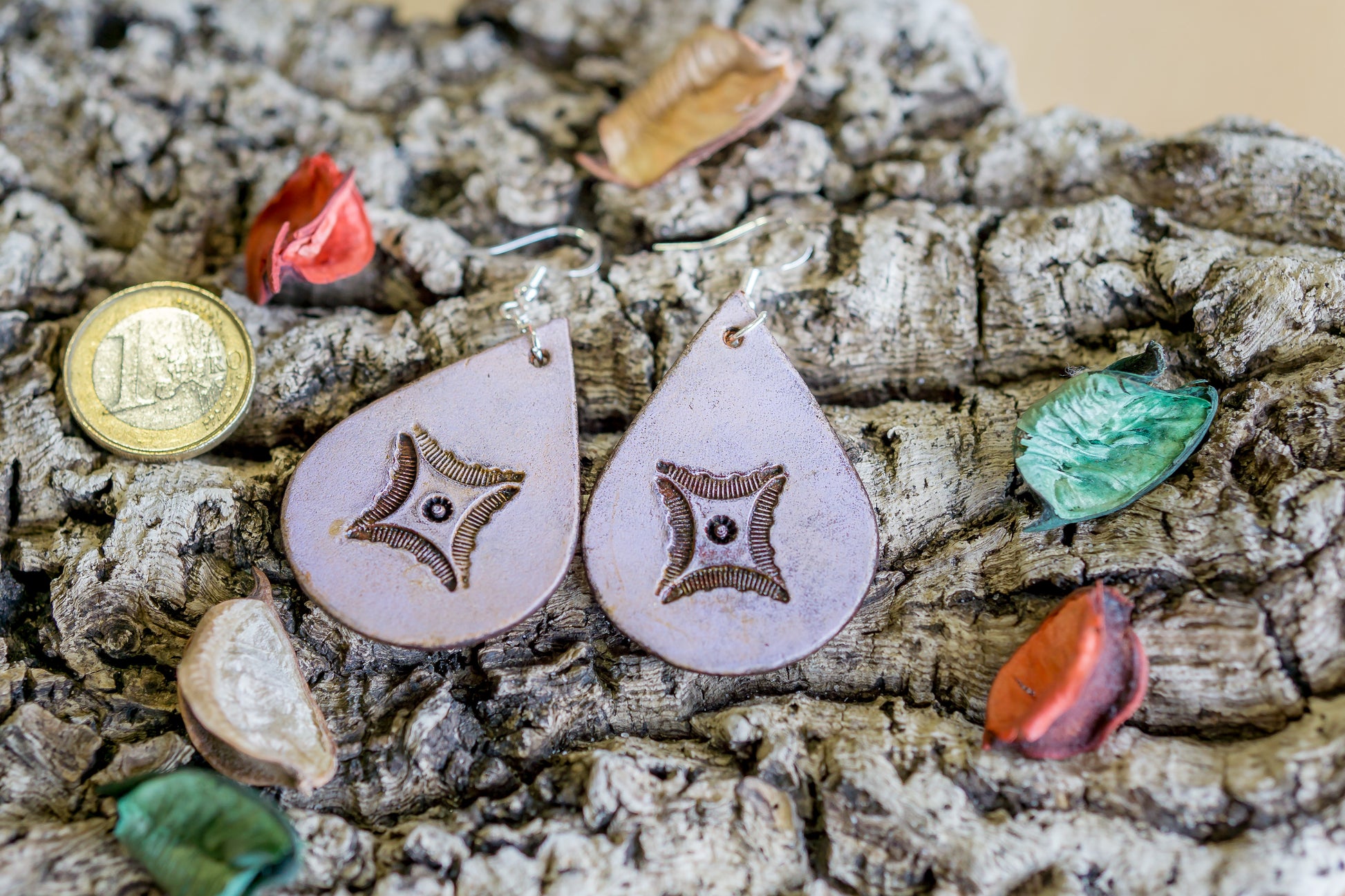 Brincos de couro em formato gota com motivos abstratos feitos à mão na cor lilás