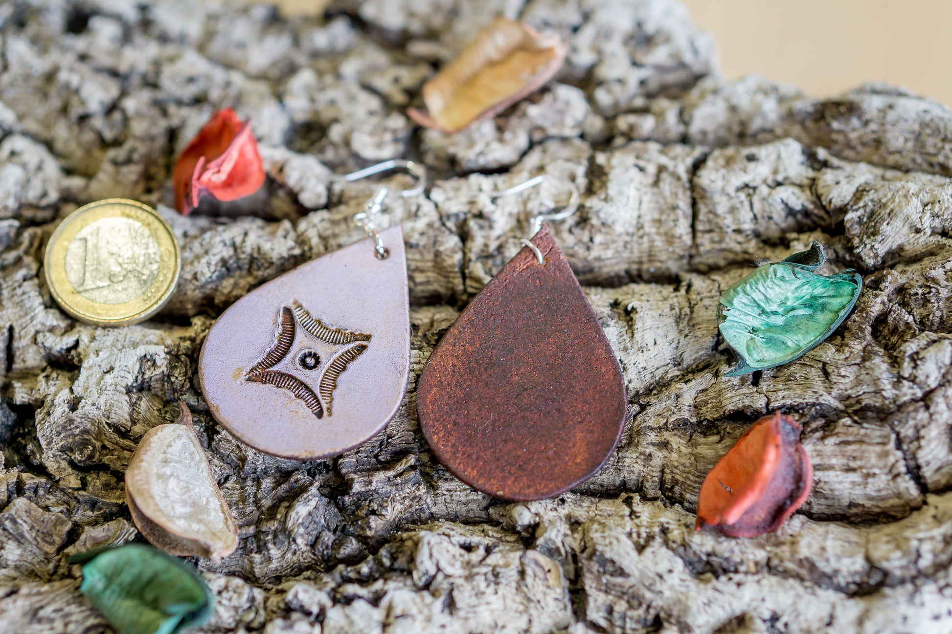 Brincos de couro feitos à mão. Couro de qualidade, curtido de forma tradicional. Feitos manualmente com todo o cuidado e atenção, refletindo-se em cada detalhe. Cada peça é trabalhada manualmente com um design vintage exclusivo e pintada à mão. Os fechos são banhados a prata. O couro envelhece lindamente, ganhando pátina com o uso. Torna-se mais suave ao toque e assume as marcas de uma peça de joalharia amada e usada ao longo do tempo.