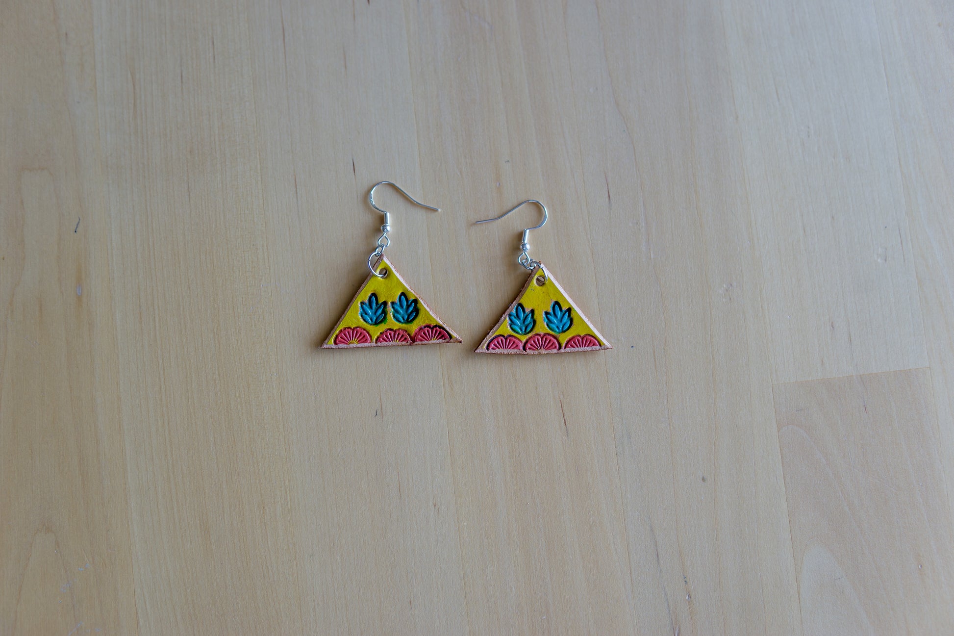 Brincos Triangulares em Couro Pintado à Mão – Design Étnico