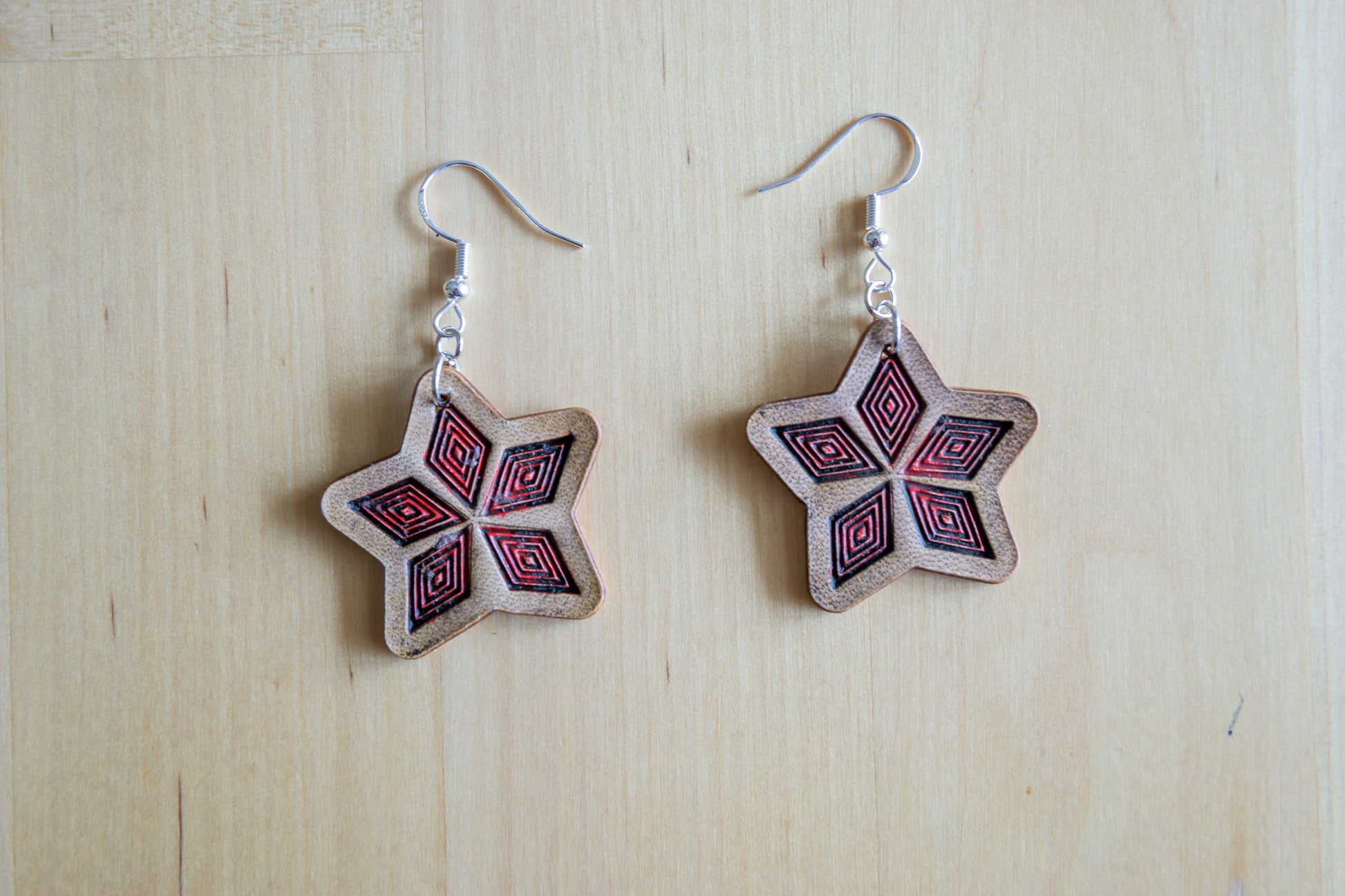 Brincos Artesanais em Couro Estrela Natural com Detalhe Vermelho Gravado